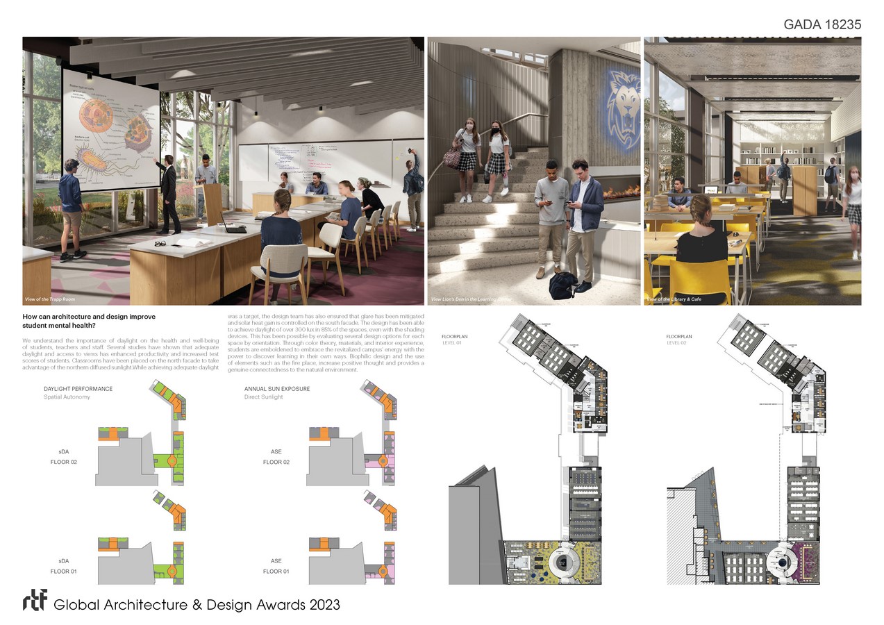With the use of color, materials and the exterior-interior experience, students who walk through the school now become part of the re-emerging campus. Different programs and activities are juxtaposed, offering new connections across various levels and inspiring curiosity and a passion for exploring. Students in the study center on the second floor can look down on performances in the learning courtyard and activities in the Zen Garden. The new design has brought a sense of place and hope to the community and created a feeling of cohesiveness out of chaos.