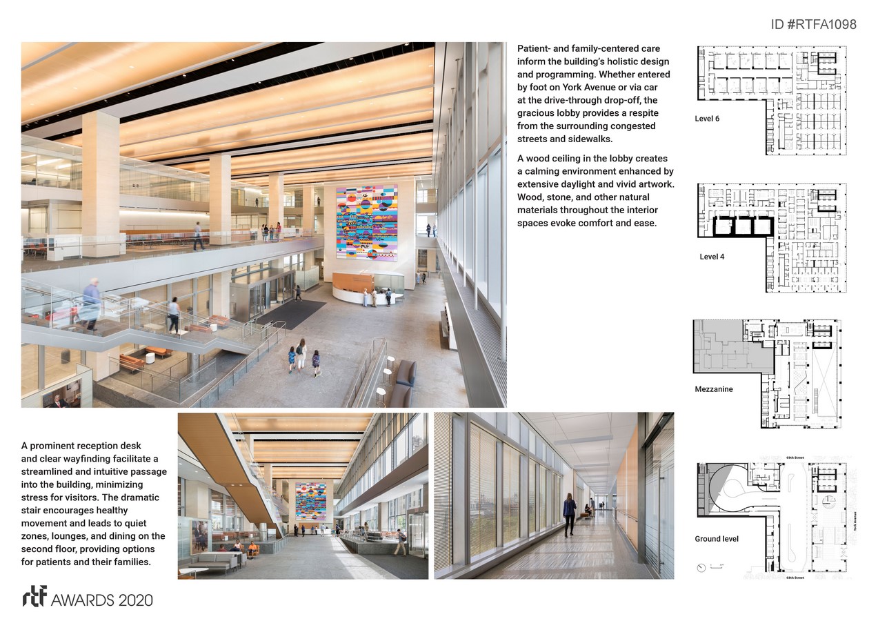 Patient- and family-centered care is at the forefront of the building’s holistic design and programming. Whether entering by foot on York Avenue or via car at the drive-through drop-off, the gracious lobby provides a respite from the surrounding congested streets and sidewalks. A wood ceiling in the lobby creates a calming environment enhanced by extensive daylight and vivid artwork. The wood, stone, and natural materials throughout the interior spaces of the facility evoke comfort and ease.