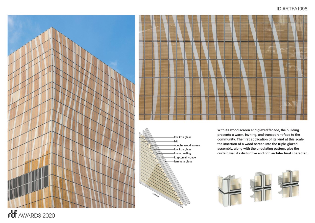 With its wood screen and glazed facade, the center offers a warm, inviting and transparent face to the community. The first of its kind at this scale, the insertion of a wood screen into the triple-glazed assembly along with the undulating pattern gives the curtain wall its distinctive and rich architectural character.