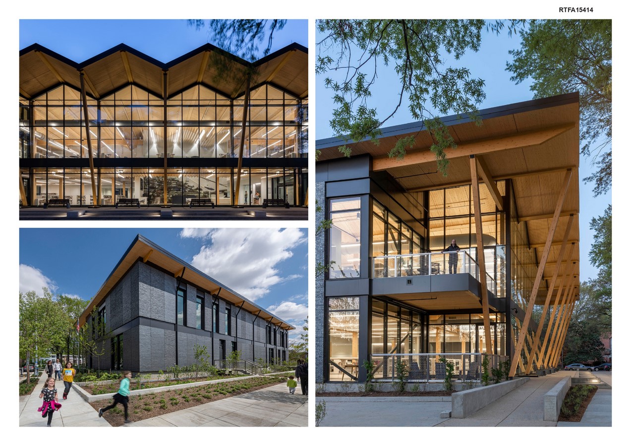 The building also features the use of a mass timber superstructure with an innovative dowel-laminated floor and roof construction. The cradle to gate life cycle of this material demonstrates a significantly reduced impact on the global warming potential, ozone depletion, fossil fuel depletion, and water intake when compared to traditional building practices. This type of prefabricated structure lends itself to producing minimal waste upon installation. Coupled with the design strategy to expose the timber structure on the interior in lieu of drywall finishing, this design decision led to an overall 15% decrease of construction waste to landfill as compared to a project of traditional structure and finishes.
