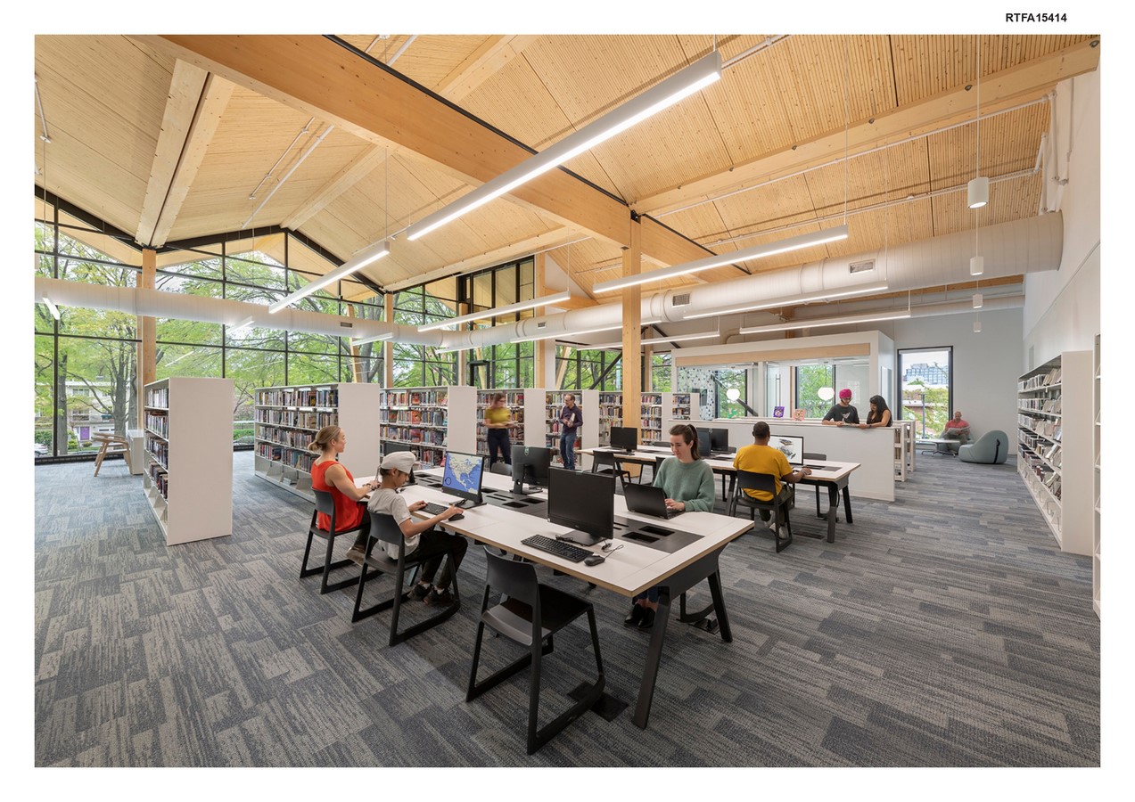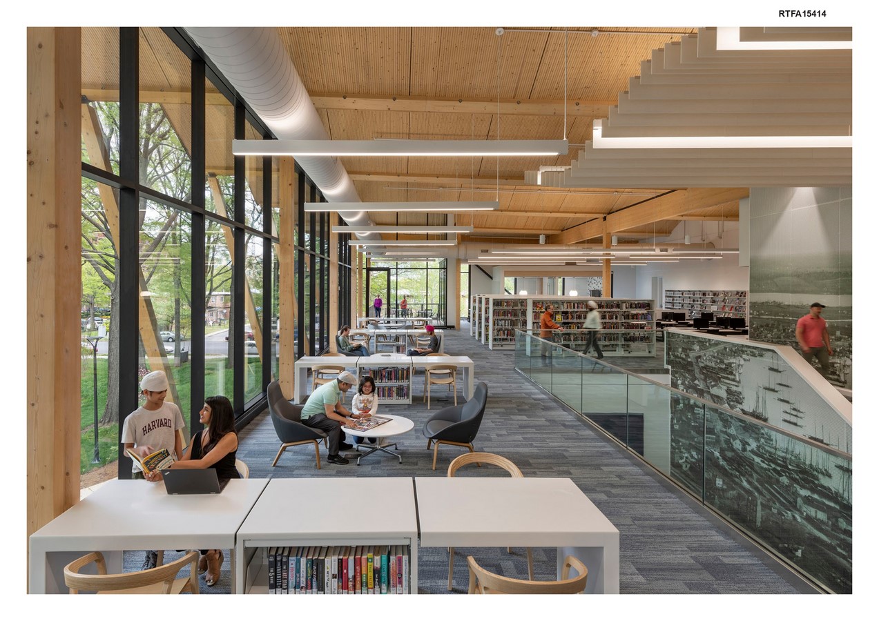 The site design and landscape optimize the library’s connection to the neighborhood. The deep porch terrace acts as a path through the city block itself, straightening an existing urban pathway that links a series of nearby park spaces throughout the neighborhood.