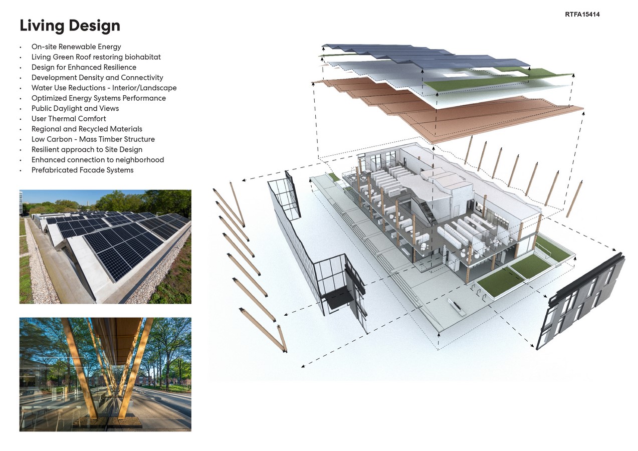 An emphasis on connection to the surrounding community has shaped the design development process. The design gives a sense of arrival, features a flexible plaza, includes a sustainable site, and maximizes views to the outdoors and natural light.
