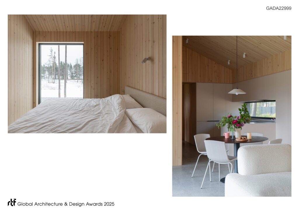 Delo House 3 is one of the studio’s standard timber-frame homes, delivered with full interior finishes and engineering systems, and furnished with original furniture and objects developed in-house. At the client’s request, the project also includes a detached annex with a kitchen-dining room and a bathroom.