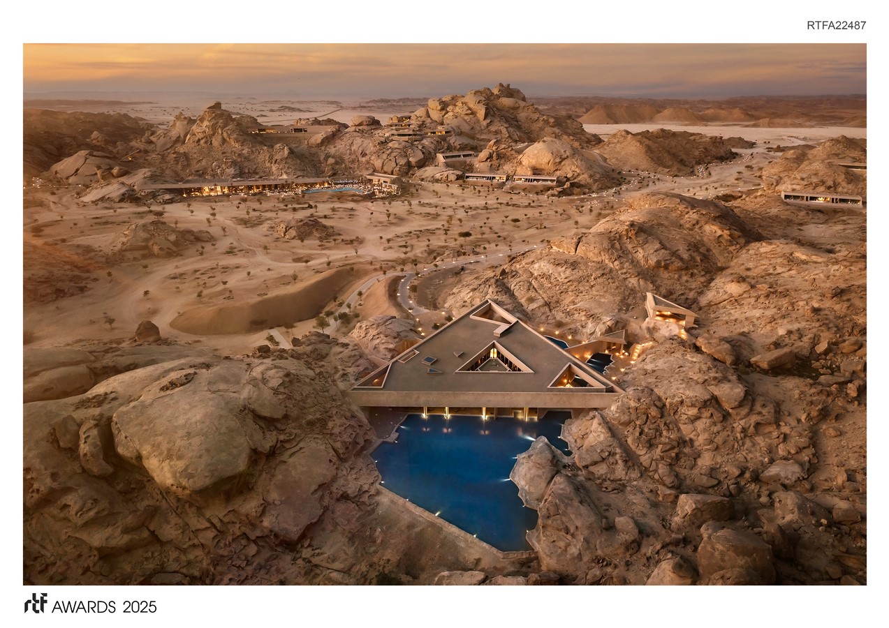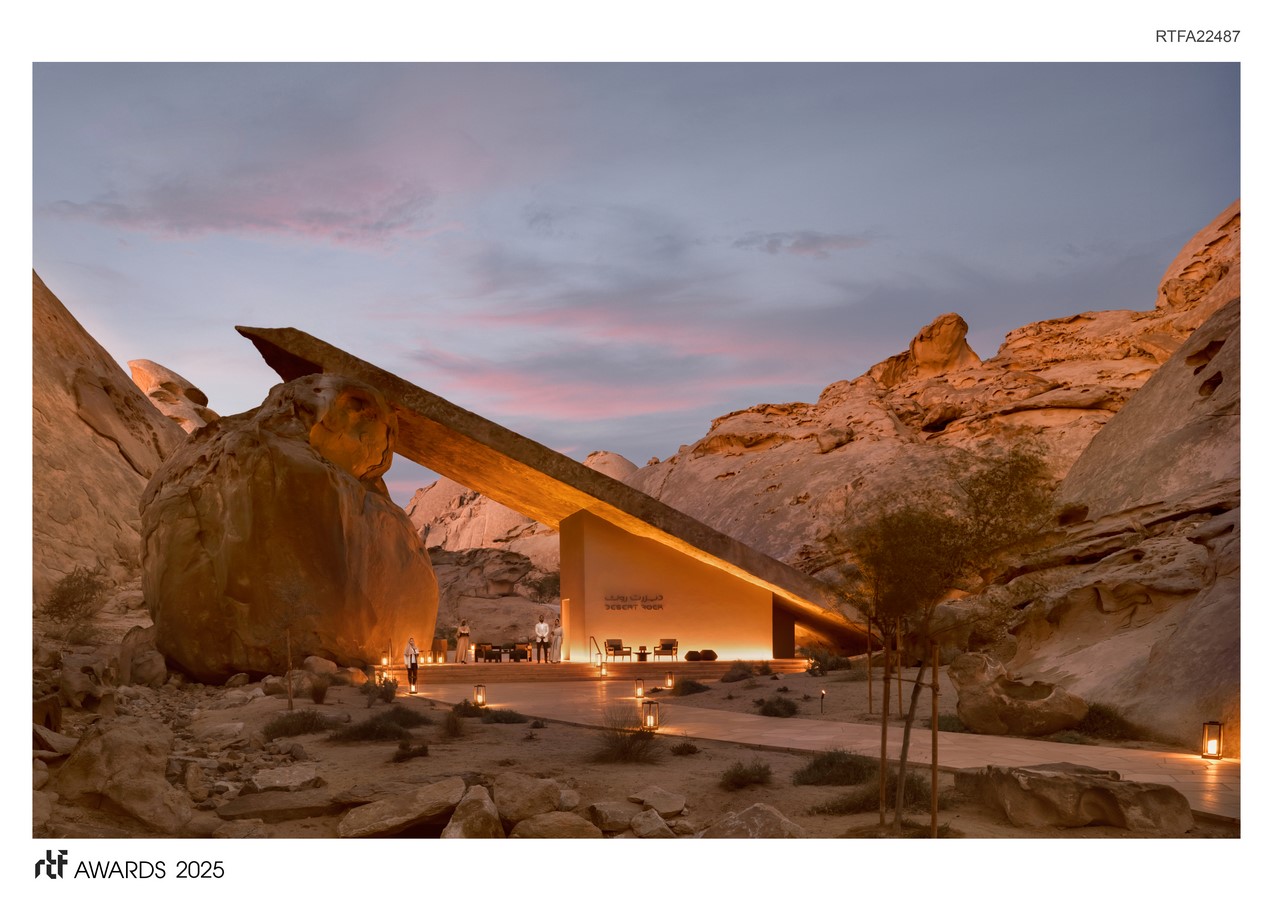 Desert Rock is part of an ambitious and unprecedented eco-tourism development in the Kingdom of Saudi Arabia, set among 11,000 square miles of islands, beaches, desert, mountains, and volcanic areas. This inland project engages with the majestic granite mountains and mythical desertscape.