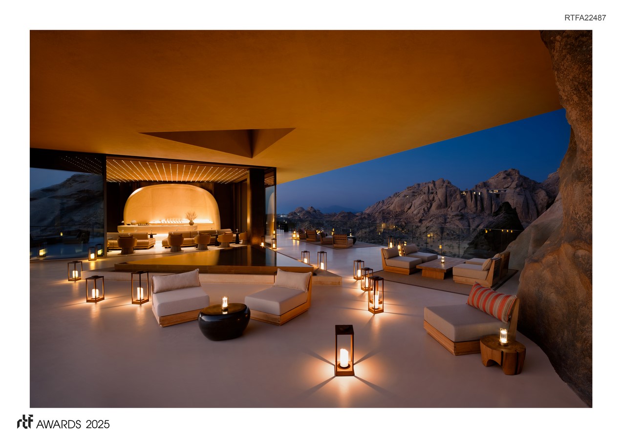 Working with the language of the earth, we have designed new spaces and experiences— buildings that disappear within the tectonic landscape, echoing ancient Nabatean civilizations that once lived in the region. Indoor and outdoor spaces are located within crevices and caves, or on shaded slopes, utilizing the cooler microclimates and minimizing solar gain. These discrete locations camouflage the architecture during the day, while at night they glow like small lanterns dotted across the massif.