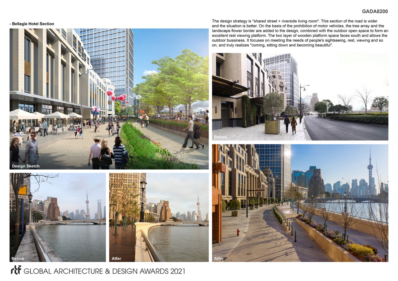 In order to release the vitality of the riverside interface and create a high-quality activity space, Hongkou District has made a detailed investigation and sorting on the waterfront roads, architectural landscape, green revetment and cultural features within the shoreline since the early stage of transformation. Combined with the overall development strategic plan of Suzhou River, it puts forward the vision of “the most beautiful riverside reception hall that is open, accessible and desirable” and “fashion With the design orientation of “combination of Shanghai style and historical features”, build a high-quality waterfront space of “walking, leisure and all-time”, realize the transformation goal of “three connections and three improvements”, and take the overall design strategy of “shared Street + riverside living room”. At the same time, the riverside space of North Suzhou Road is broken through, and the space is divided into Hotel Shanghai Vital Garden Section, Bellagio Hotel Leisure Viewing Section, Postal Building Style Display Section, Hebin Building Characteristic Section, forming the overall planning structure of “one bank and four sections”.