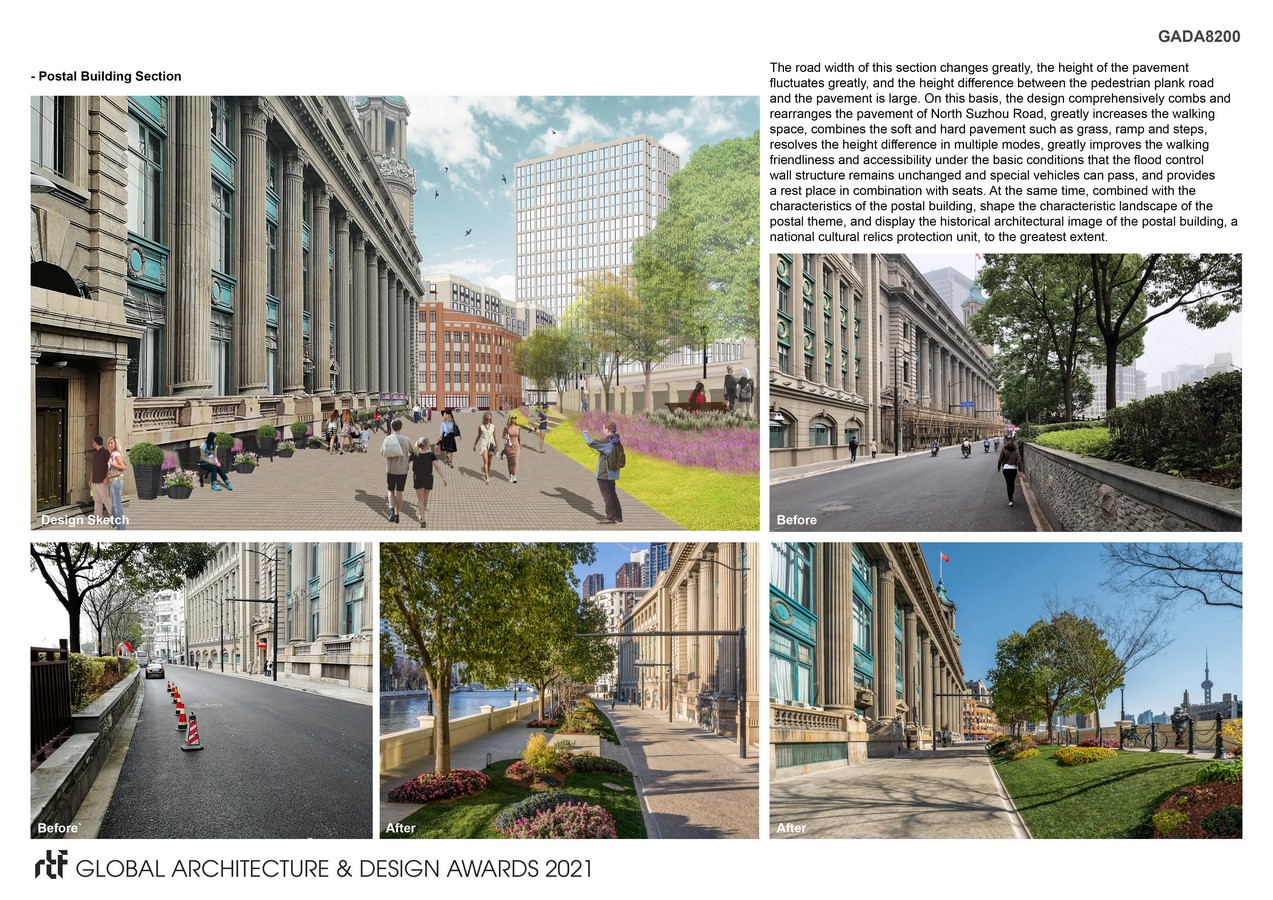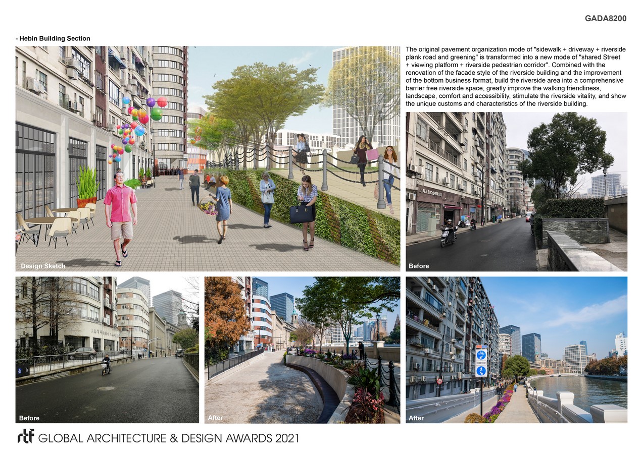 The pavement of North Suzhou road is comprehensively combed and rearranged under the current problems of many spatial breakpoints, narrow sidewalks, large pavement height difference, no water in the riverside, dirty and messy environment and so on. The original pavement organization mode of “sidewalk + driveway + riverside plank road and greening” is changed to a new mode of “slow space + shared Street + viewing platform + riverside walk corridor”, which greatly improves the friendliness and accessibility of walking. At the same time, it puts forward targeted function replacement suggestions and corresponding design schemes for buildings and spaces along the street, people-oriented, focusing on meeting the needs of citizens for sightseeing, sightseeing and rest, creating an accessible, interpretable and experiential service space, further improving the overall environment and displaying regional characteristics.