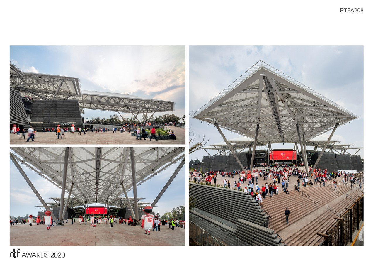 The procession from Alfredo Harp Helú Stadium grounds into the ballpark alludes to climbing an ancient Mesoamerican temple. As the spectator approaches the grand entrance, they are confronted with six truncated pyramids cladded in indigenous volcanic rock. Once inside, a ring connects all the seats and functions into one experience with unobstructed views to the field. The key goal for Alfredo Harp Helú Stadium is the vision of a great public space, where the open space is as important as the built space, which is a prominent architectural feature within Mexican culture. Successful spaces must encourage strong social engagement, incorporate Mexican traditions and respect existing natural conditions. Therefore, the new stadium is seamlessly integrated into four major public spaces with very distinct characteristics.