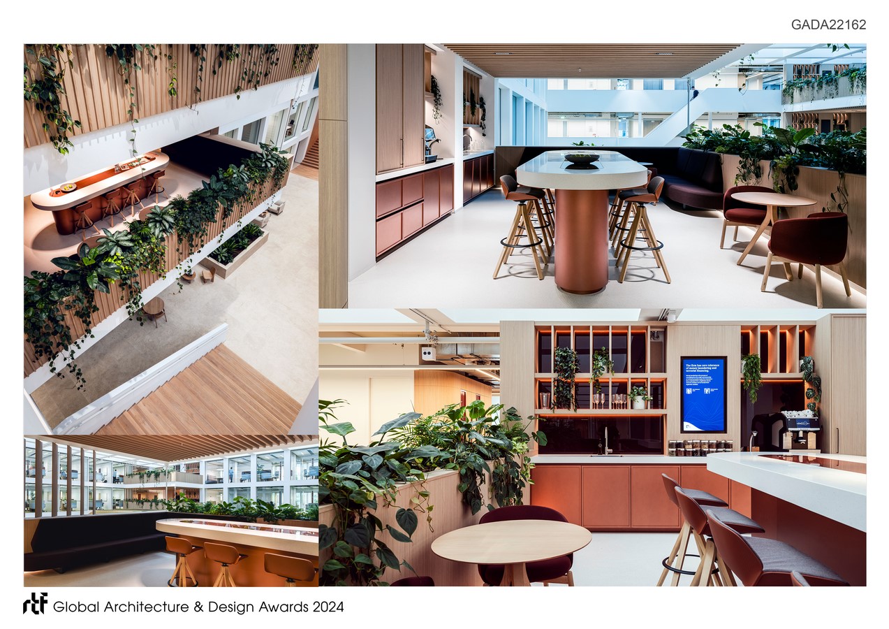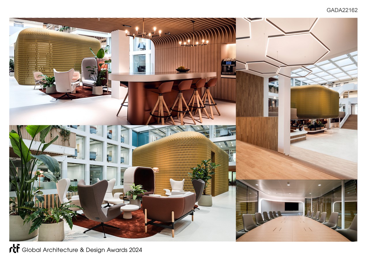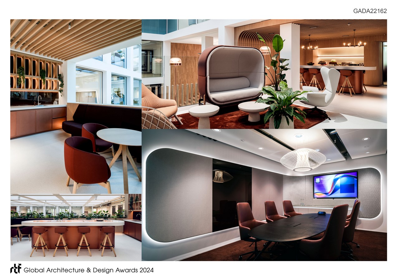 Since legal firms are fond of rooms, rather than open spaces, we decided to develop our design with communication and collaboration in mind for every space. Combining well-being with hospitality. We used the transparency of the building on both the inner and outer side (atrium and façade). Complementing the rudimental square shaped architecture with soft shapes, classy yet timeless colours, and innovative materials. The idea was to make the people forget they are working in an office building. Providing the vibe and feeling one might have in a resort, a home or a bar in town. We created a world on its own within these powerful facades.