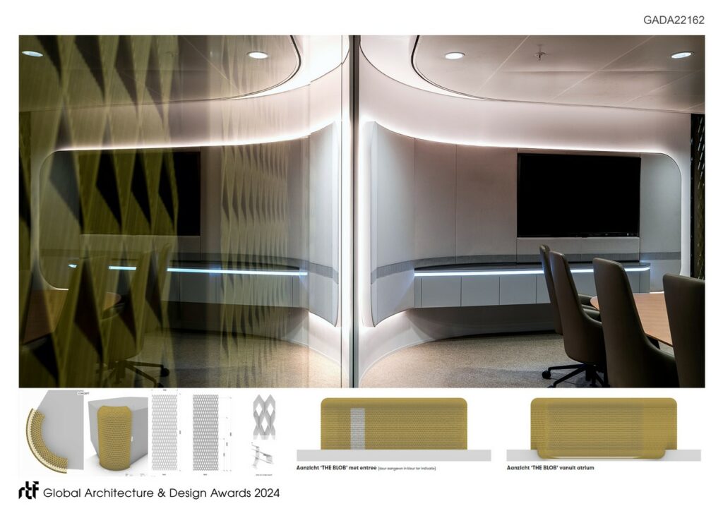 Then there is the iconic sculpture in the middle of the atrium. “The Hive”. A 3D printed element that beholds a meeting room. The idea was to create a centre-piece that would complete the large void of the atrium in a differentiating way. The contrast with the square shaped facades and roof windows is strong and the scale of the 3D pattern adds refinement and beauty to the constructional elements of the building. It provokes curiosity and marvel. The skin is made in such a way that daylight falls through, but visibility is limited. In addition, the sculpture shelters the client dedicated area behind it. Since the atrium is the central part of the building, the 3D sculpture is a point of recognition, and a character adding element in the identity of DLA Piper.