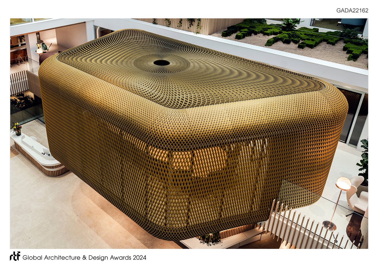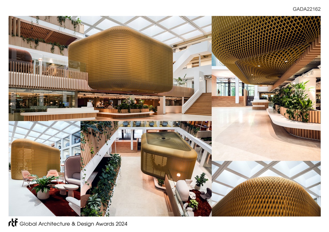 Since legal firms are fond of rooms, rather than open spaces, we decided to develop our design with communication and collaboration in mind for every space. Combining well-being with hospitality. We used the transparency of the building on both the inner and outer side (atrium and façade). Complementing the rudimental square shaped architecture with soft shapes, classy yet timeless colours, and innovative materials. The idea was to make the people forget they are working in an office building. Providing the vibe and feeling one might have in a resort, a home or a bar in town. We created a world on its own within these powerful facades.