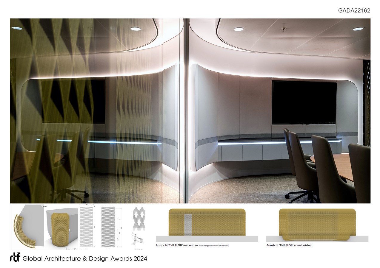 Then there is the iconic sculpture in the middle of the atrium. “The Hive”. A 3D printed element that beholds a meeting room. The idea was to create a centre-piece that would complete the large void of the atrium in a differentiating way. The contrast with the square shaped facades and roof windows is strong and the scale of the 3D pattern adds refinement and beauty to the constructional elements of the building. It provokes curiosity and marvel. The skin is made in such a way that daylight falls through, but visibility is limited. In addition, the sculpture shelters the client dedicated area behind it. Since the atrium is the central part of the building, the 3D sculpture is a point of recognition, and a character adding element in the identity of DLA Piper.
