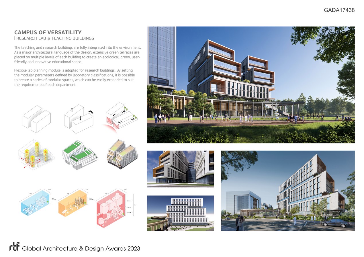 The teaching and research buildings are fully integrated into the environment. As a major architectural language of the design, extensive green terraces are placed on multiple levels of each building to create an ecological, green, user-friendly and innovative educational space. Flexible lab planning module is adopted for research buildings. By setting the modular parameters defined by laboratory classifications, it is possible to create a series of modular spaces, which can be easily expanded to suit the requirements of each department.