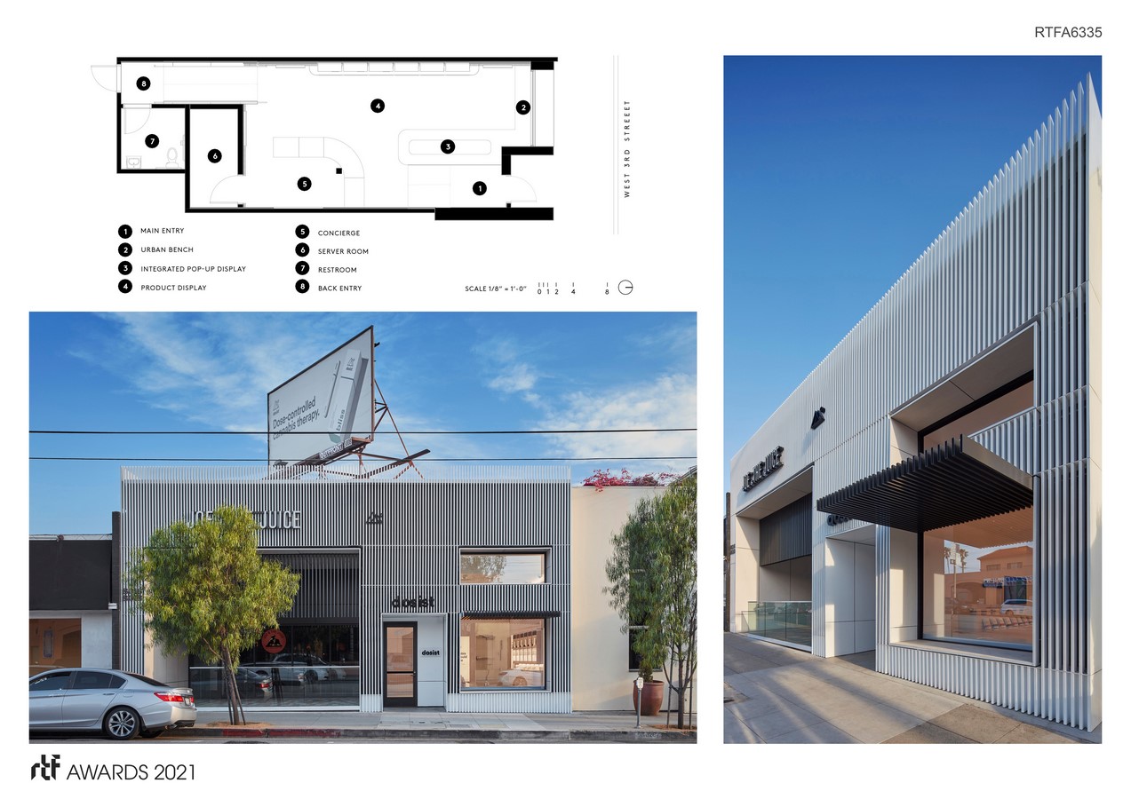 Led by the Dosist internal design team, this 800 square foot location creates a high-impact space in a compact footprint of urban infill in the trendy Fairfax District of Los Angeles. The design redefines the cannabis industry as wellness environment and challenges the norms of the traditional dispensary typology. Guests are greeted by a “Dosist guide” who acts as a personal concierge to guide the experience. Dissolving the trappings of transactional retail models, the small and intimate offers a personalized and one-on-one conversation with an emphasis on brand awareness via a “wellness in every detail” philosophy. The entry welcomes guests with a low, wooden bench with rounded corner integrated with a pop-up product display surface that guides visitors into the space. As it wraps inside it invites guests to a window that frames a view to the urban neighborhood street.