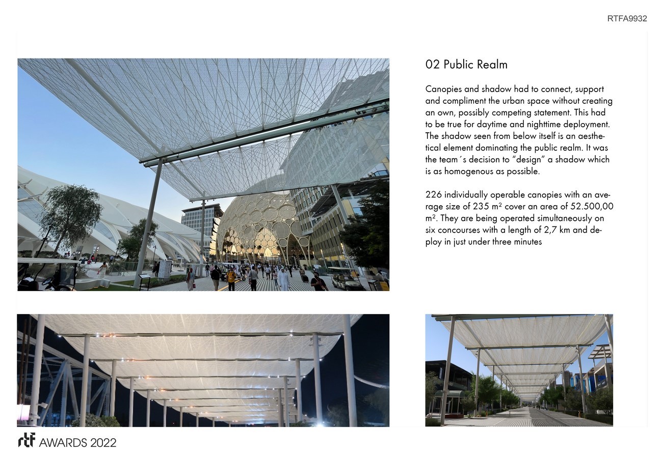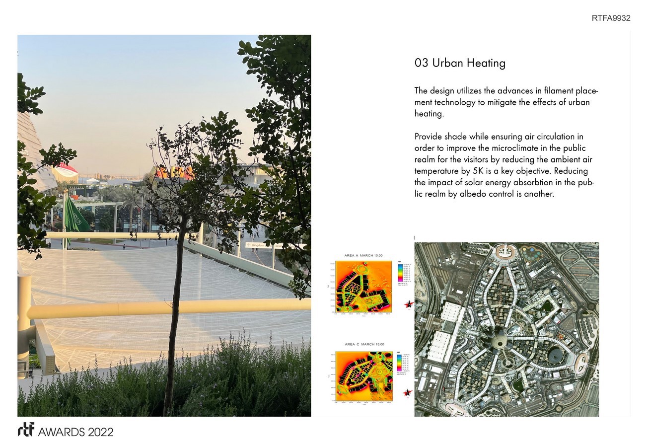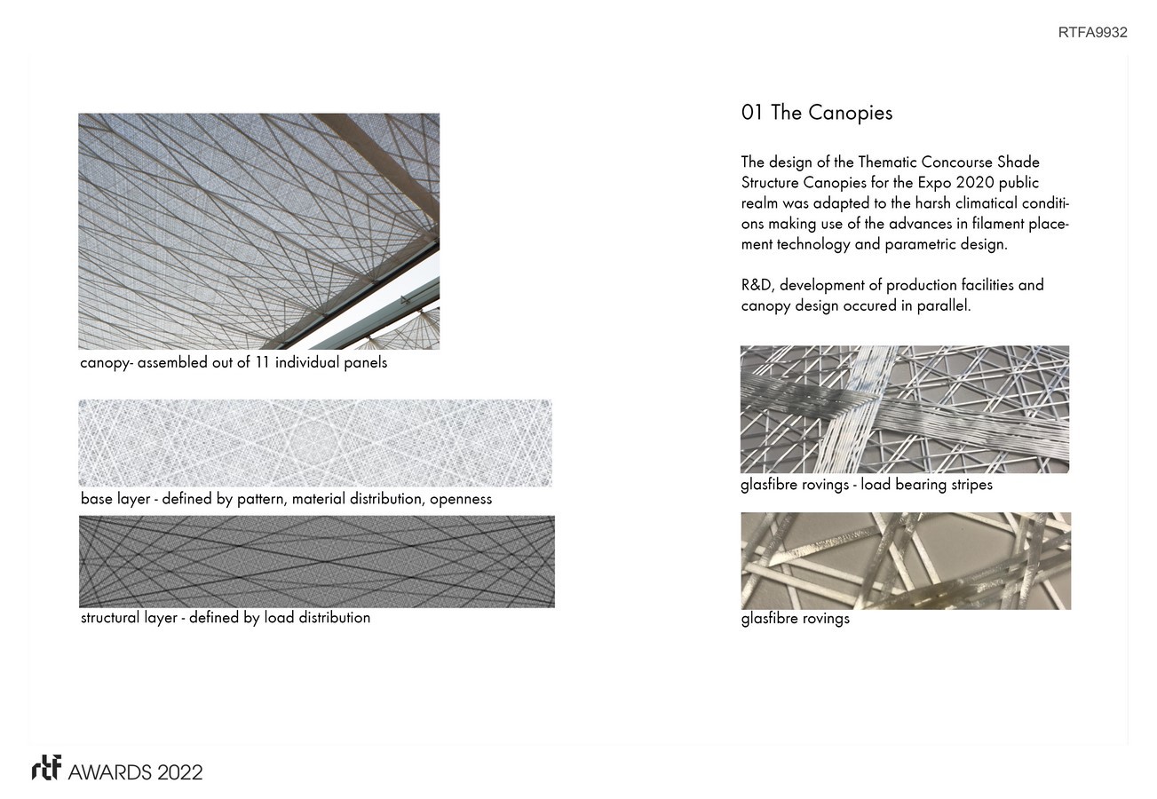 The design of the Thematic Concourse Shade Structure for the Expo 2020 public realm was adapted to the harsh climatical conditions making use of the advances in filament placement technology and parametric design to mitigate the effects of urban heating. The canopy is to be retractable, permeable, non flameable, recyclable, suitable for projections and the materials utilized need to be environmentally sustainable und fit for circular economy.