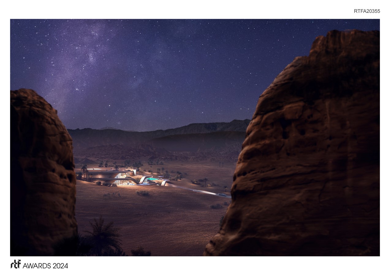 Within the Dune Residence, every detail is carefully curated to evoke a sense of tranquility and harmony with nature. The interior surfaces are adorned with textured sandstone, seamlessly connecting the ceilings, walls, and floors to create a cohesive and visually captivating space. Enhanced by ambient lighting, the sandstone surfaces exude a warm and inviting ambiance, drawing the gaze towards expansive windows that frame panoramic views of the desert landscape.