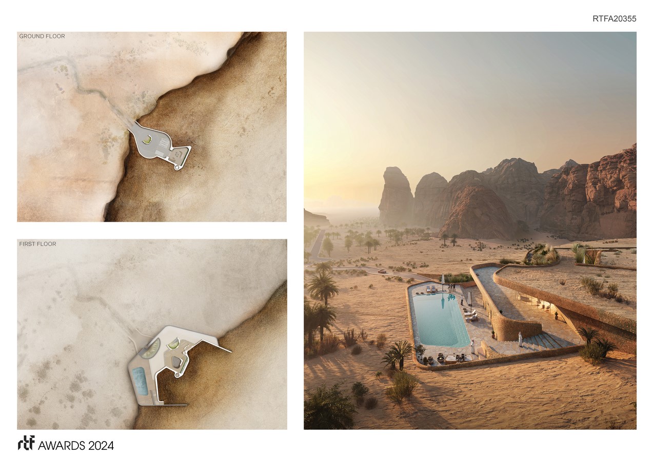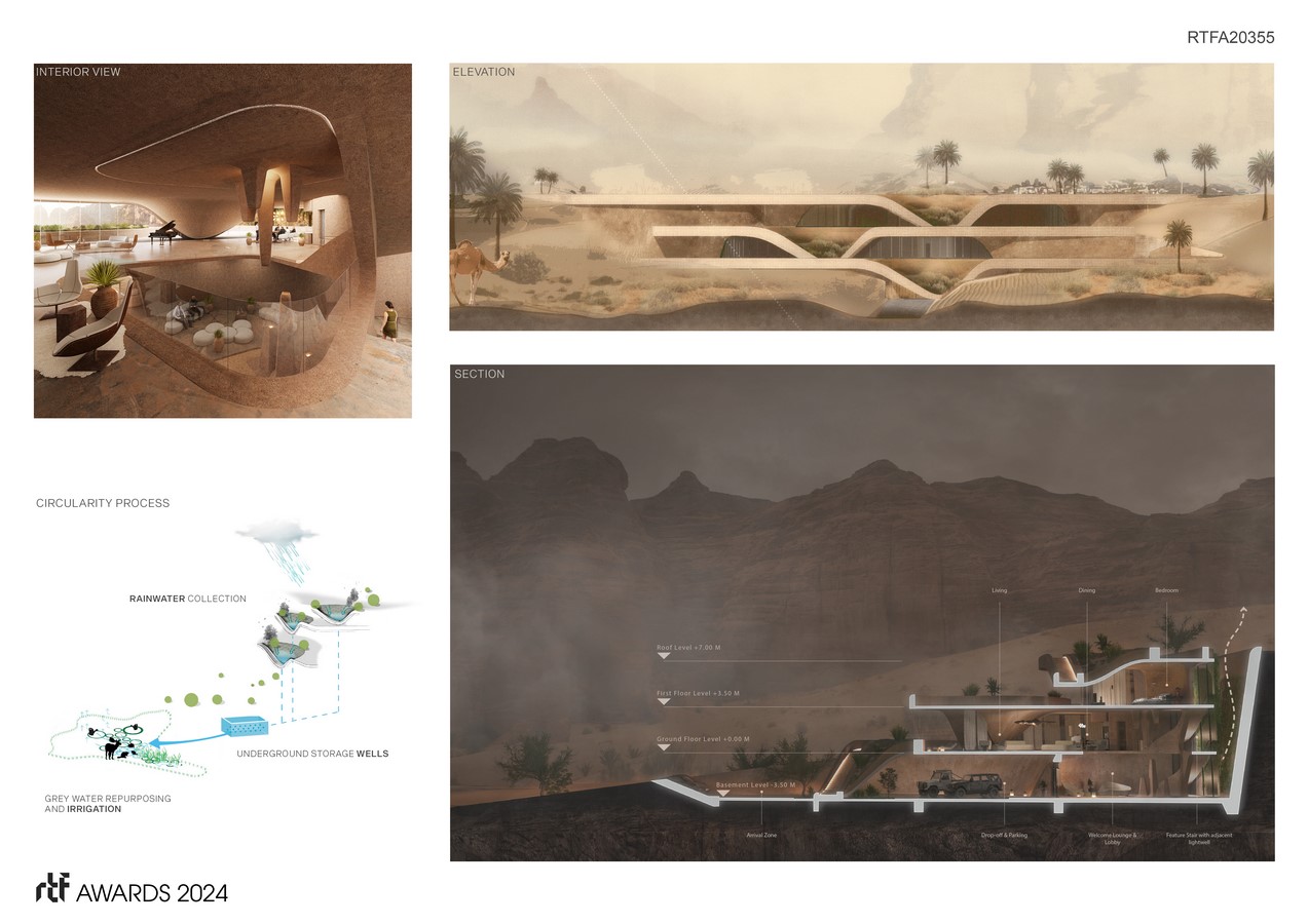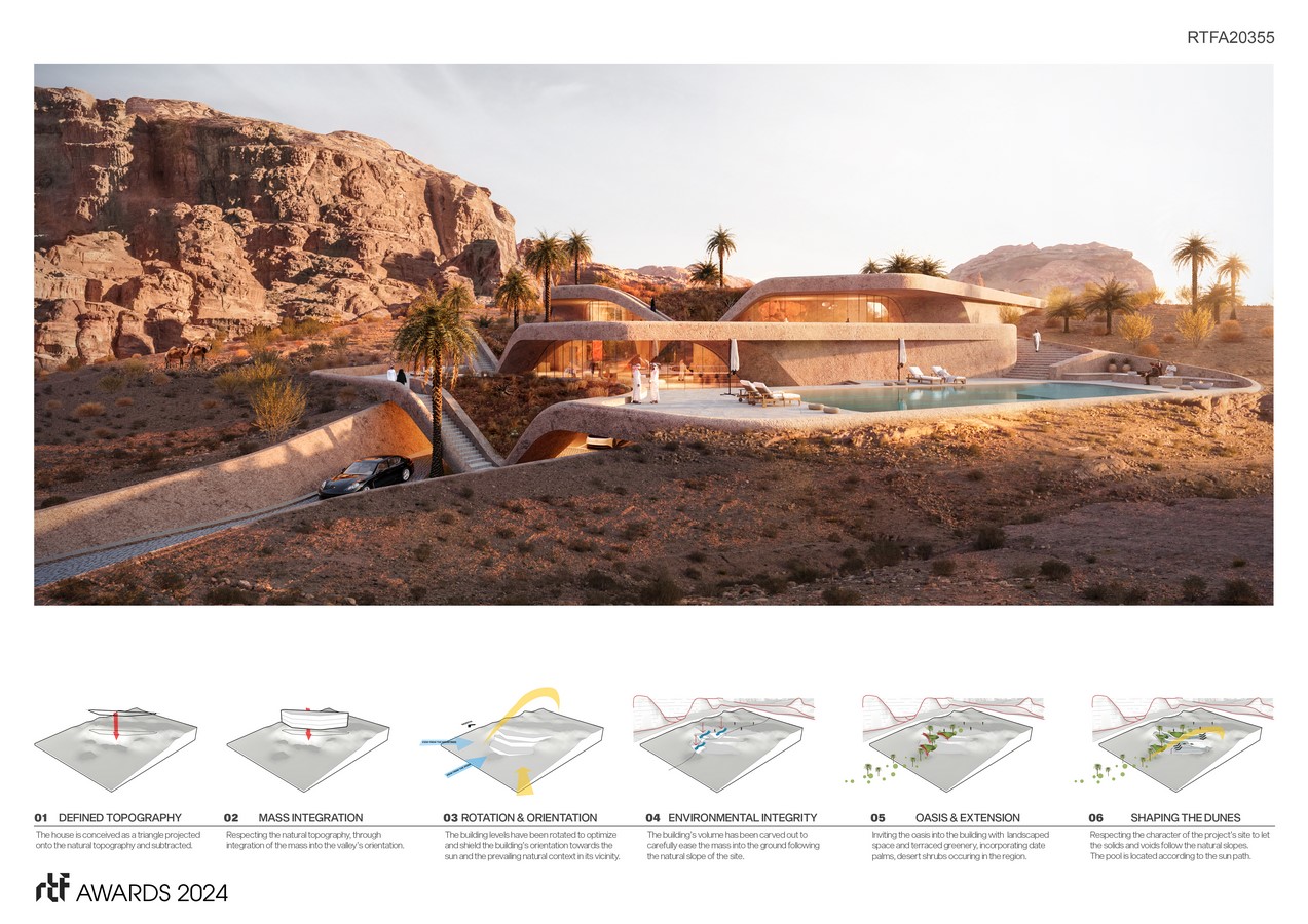 At the heart of the Dune Residence project lies a commitment to sustainability and environmental stewardship. Innovative features, such as rain catchment pans integrated into the roof structure, capture dew and rainfall to nourish a lush green roof and replenish the neighboring oasis. The building’s structural design not only withstands the harsh desert climate but also serves as a passive thermal regulator, absorbing heat during the day and releasing it slowly at night to maintain optimal indoor temperatures. Additionally, the utilization of locally sourced materials and the conservation of natural resources further reinforce the residence’s sustainable ethos.