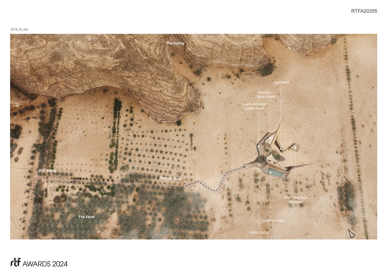The design concept of Dune Residence revolves around the idea of creating a sanctuary that celebrates the beauty of its desert locale. The building’s volume is meticulously sculpted to gently merge with the terrain, respecting the site’s topography while optimizing its orientation to harness natural light and ventilation. Inspired by ancient architectural techniques, such as wind catchers, the residence utilizes passive cooling strategies to promote natural cross ventilation, ensuring a comfortable and sustainable living environment.