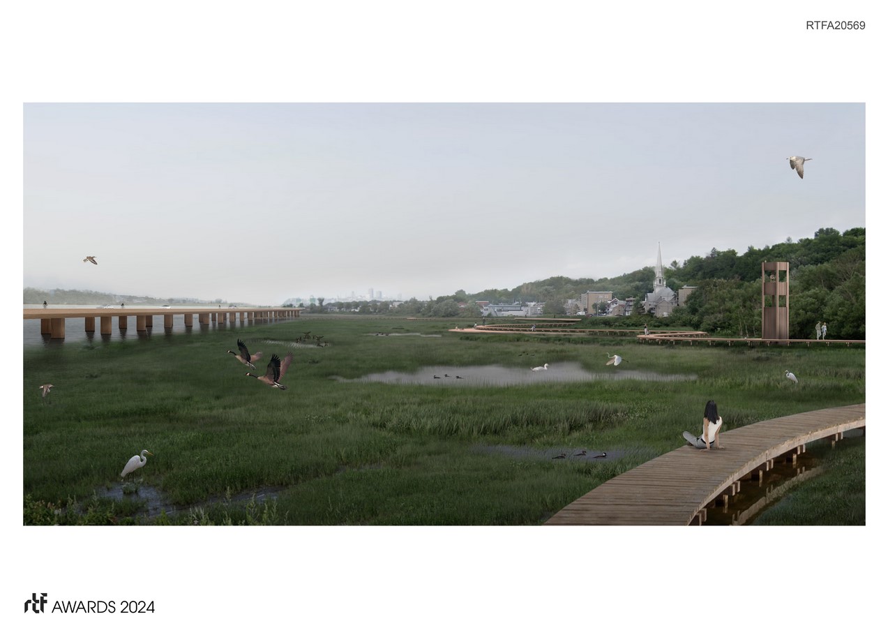 Embracing the nuances of the tidal flats, this large linear park favors gentle interventions and the optimization of existing infrastructures. A series of sponge parks, placed along the long stretch of land, act as new public transition spaces between the existing neighborhoods and the new urban boulevard and tidal flats beyond. In continuity with the evolving nature of the river, the artificial terrain gradually gives way to the dynamic movement of water. This temporal aspect, alongside those of the seasons and tides, calls for a reinterpretation and rediscovery of the riverside experience.
