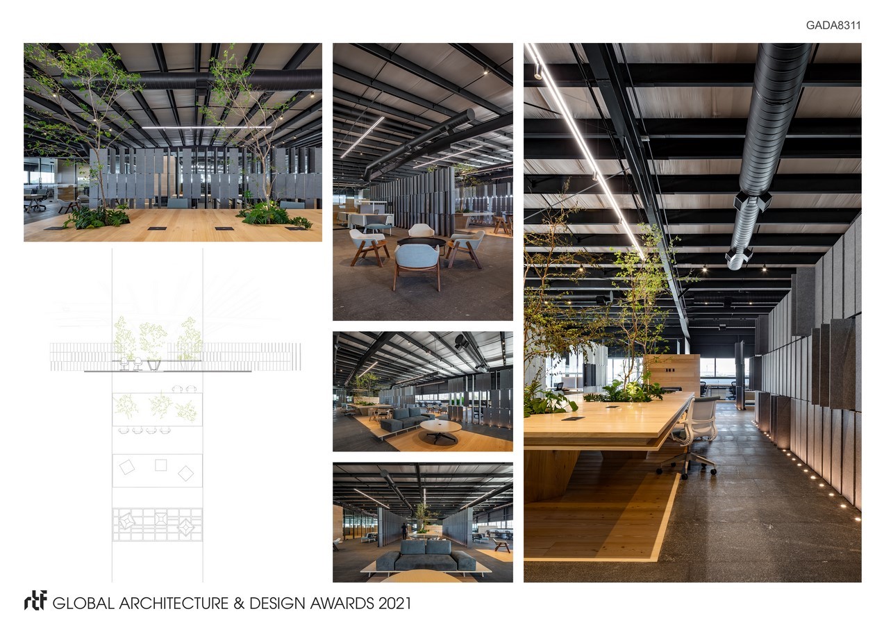 Wood, stone and glass are the main materials applied to the space. We also integrated textile finishes and restored old machinery, seeking to align the identity and materiality of the space with the daily productive activity of the company.