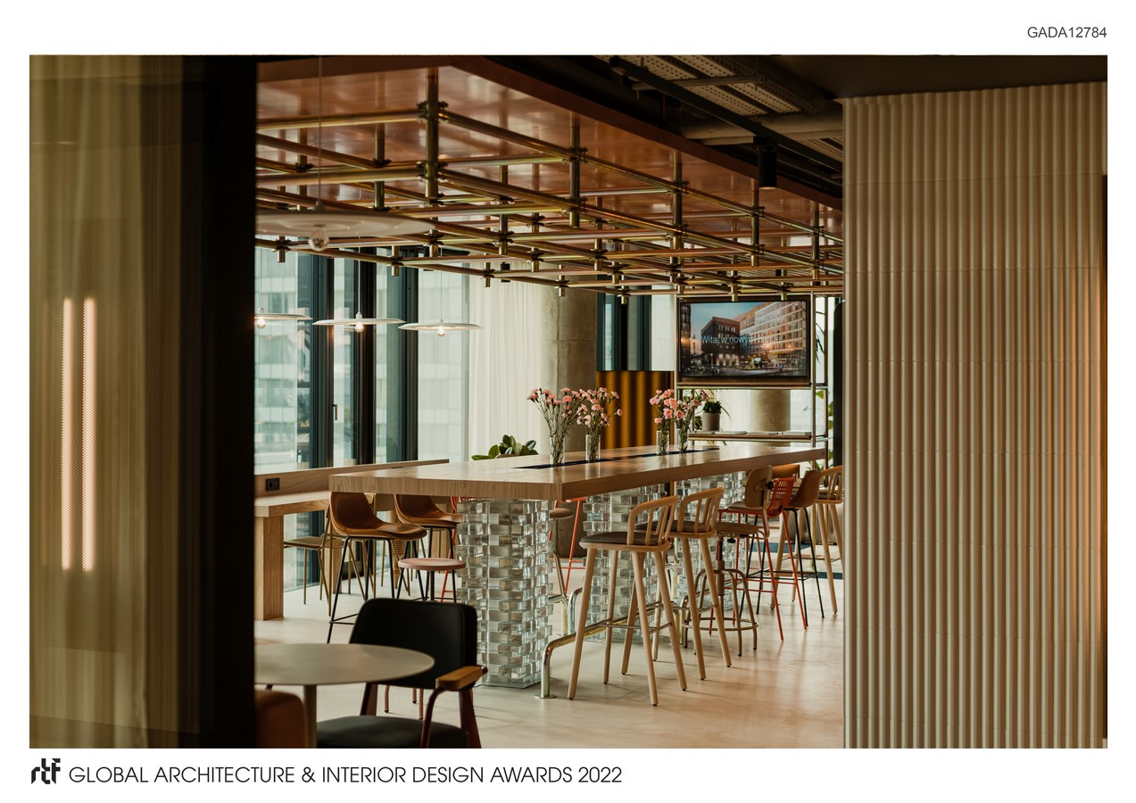 Another source of inspiration was Warsaw Breweries – the place where the Echo Investment office is located. Numerous copper details refer to the brewing vats. In addition to copper, the design uses original cast-iron poles from the demolition of the former breweries buildings, which have been given a new function – plant pots.
