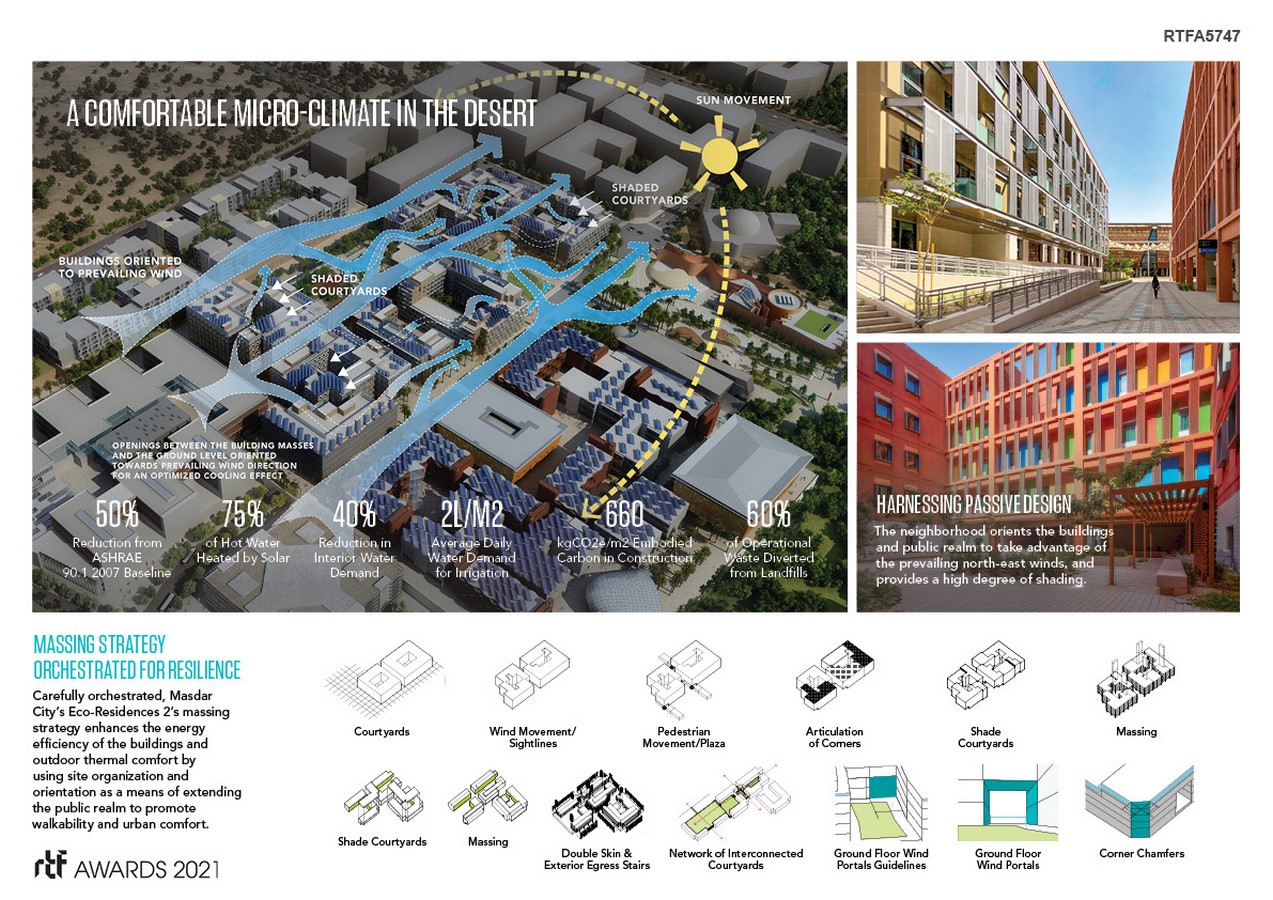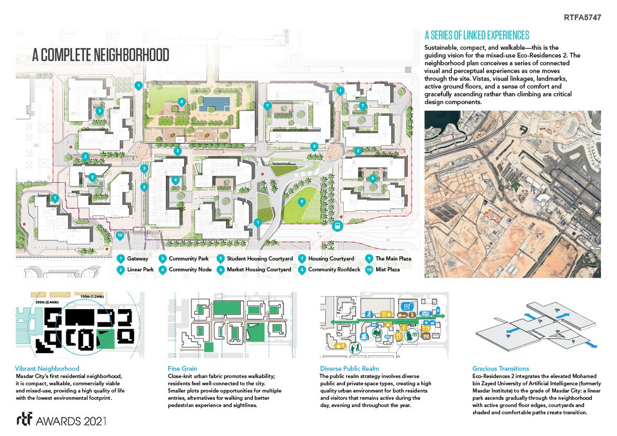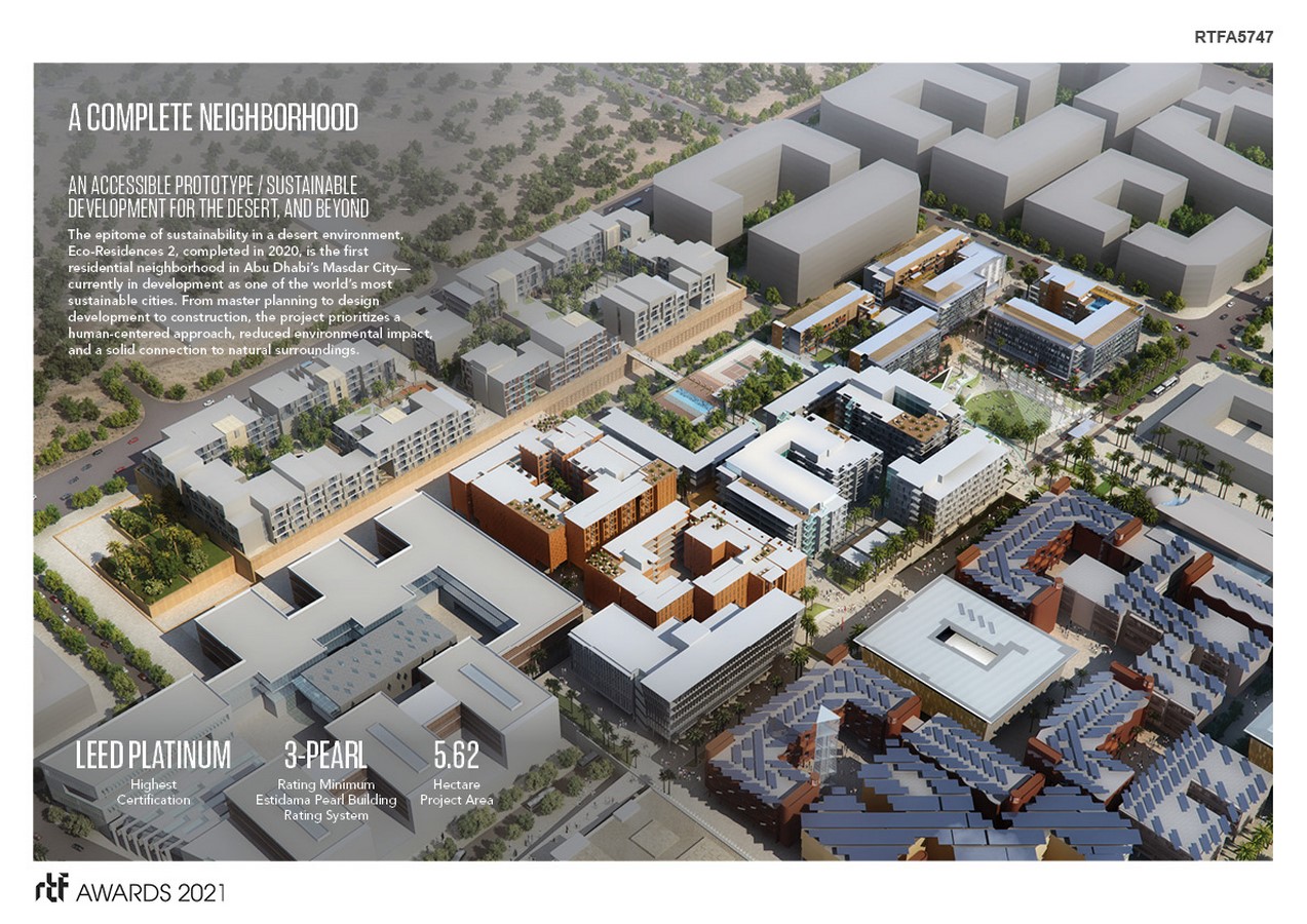 Completed in 2020, LEED Platinum-certified and Estidama PBRS 03-Pearl rated, the neighborhood conserves energy and water, minimizes GHG emissions, promotes biodiversity, and limits the use of high-embodied-energy materials while creating an attractive and inspiring environment.