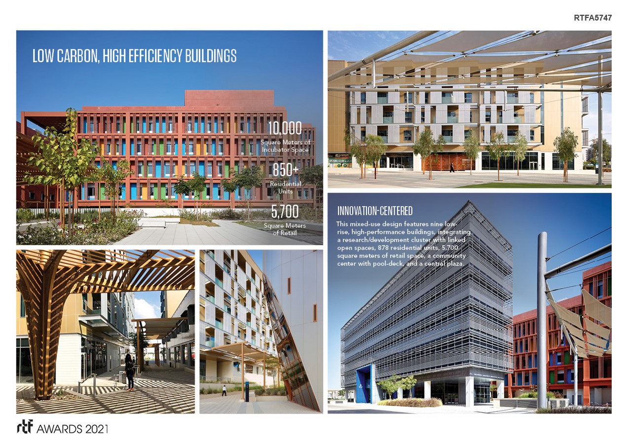 Nine low-rise, high-performance buildings frame comfortable walkways and courtyards (“sikka” and “baraha”), solidifying and expanding Masdar City’s vision. Prioritizing human-centered design within a framework of market feasibility, the designers shaped a fine-grained, pedestrian-friendly, environmentally sustainable residential neighborhood. Integrating a research-development cluster with open spaces, it features 878 residential units, 5,700-square-meter retail space, a pool deck, and a central plaza; the district’s Incubator Building—crisp in its metal-wrapped sun-shading façade—hosts start-ups, small-and-medium-sized enterprises, and regional multinationals.