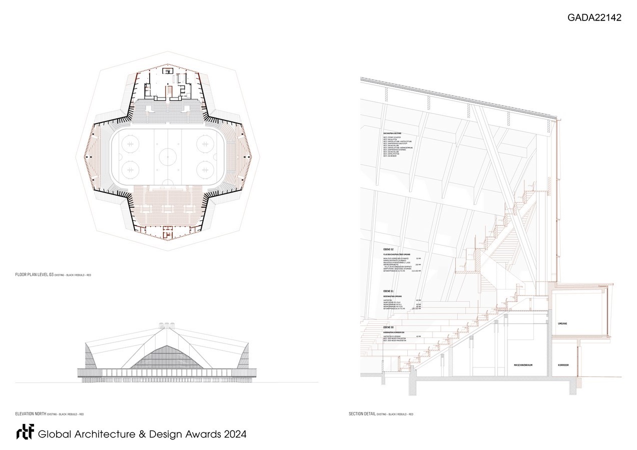 The area surrounding the facility continues the character of the Kurgarten across the Kurgartenstrasse and integrates the ice rink and sports center into the green space. Green areas are arranged in such a way that a continuous effect of the green space can be guaranteed and at the same time functional areas such as parking, deliveries, car access, and TV compounds find their place. The project cleans up the additions and structures of the main building that have grown over the decades. The introduction of the surrounding, octagonal volume creates a connection that connects everything and efficiently clarifies internal processes and escape. The originally symmetrical hall is extended on the north side to accommodate the new space. The north side also forms the new main entrance to the stadium. Through the interaction on the first floor, the spectators move into the respective sector and find the corresponding buffets and break areas. A second entrance, especially for away supporters, is on the south side. This concept of access allows for conflict-free access, even in risk games. The guest and home player access points are separated from each other and from the visitors.