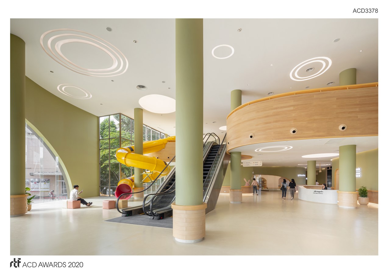 With children’s mindset, design approach of EKH CHILDREN HOSPITAL is to make the project a ‘fun’ place by incorporating many components of playground design. We use many elements as giant slider situated right at the front of the entrance hall, transforming waiting area of each clinic into a playground, indoor swimming pool with bunch of artificial clouds floating atop.