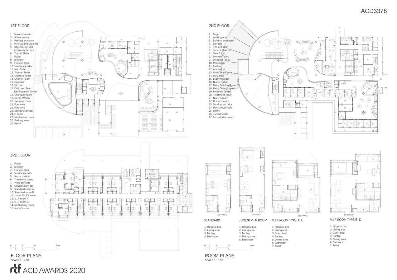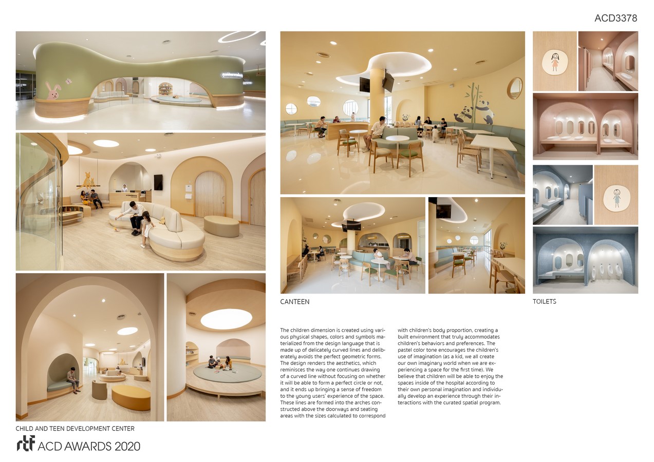 The children dimension is created using various physical shapes, colors and symbols materialized from the design language that is made up of delicately curved lines and deliberately avoids the perfect geometric forms. The design renders the aesthetics, which reminisces the way one continues drawing of a curved line without focusing on whether it will be able to form a perfect circle or not, and it ends up bringing a sense of freedom to the young users’ experience of the space. These lines are formed into the arches constructed above the doorways and seating areas with the sizes calculated to correspond with children’s body proportion, creating a built environment that truly accommodates children’s behaviors and preferences. The pastel color tone encourages the children’s use of imagination (as a kid, we all create our own imaginary world when we are experiencing a space for the first time). We believe that children will be able to enjoy the spaces inside of the hospital according to their own personal imagination and individually develop an experience through their interactions with the curated spatial program.
