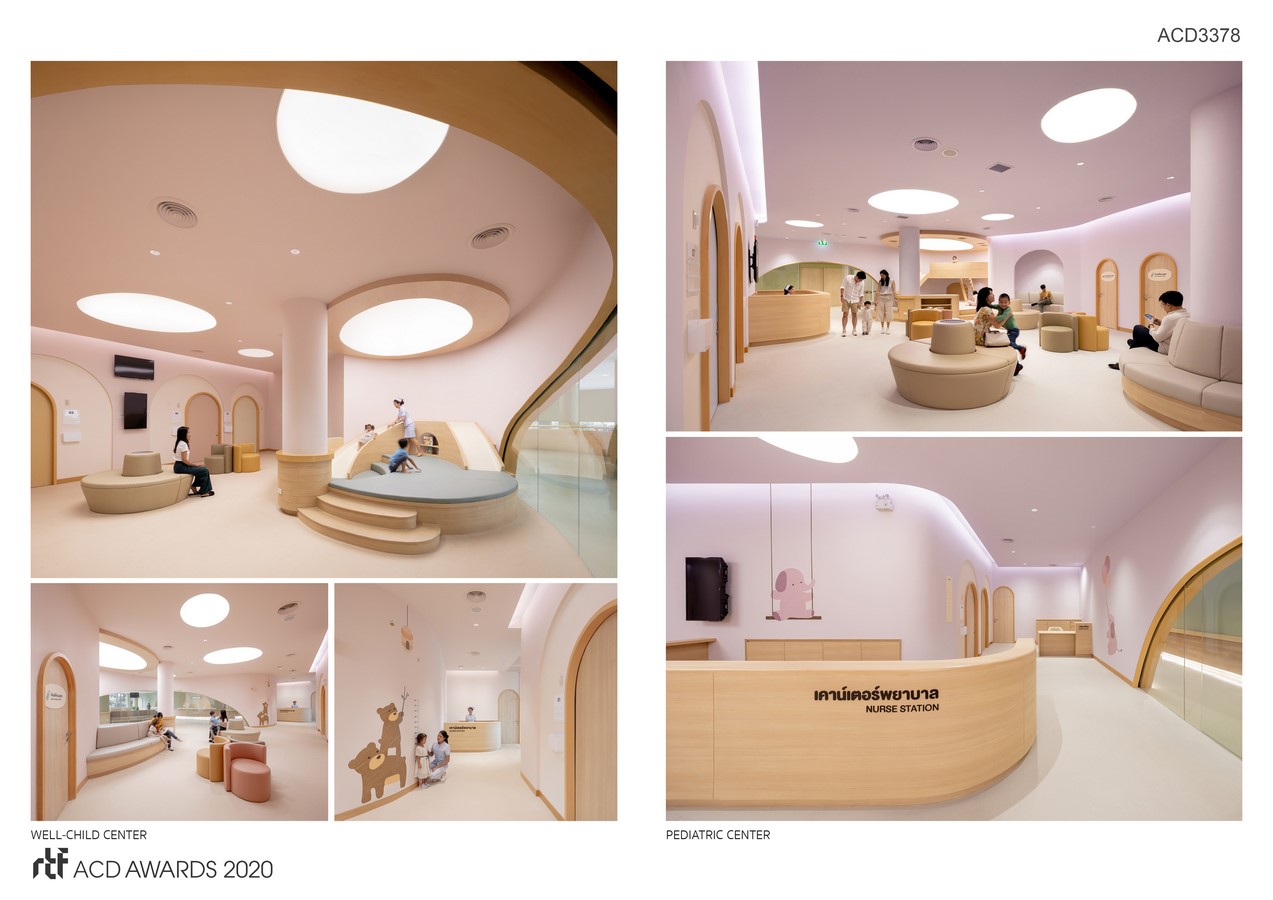 A scenario is designed and constructed near the pharmacy counter as a part of the layout of the ‘waiting area’, which embraces the ‘play space’. The program enables interactions between parents and children while allowing the adults to watch over their little ones during the wait. The use of indirect light with all the hallways of the hospital ensures that the young patients won’t be disturbed by the discomfort of excessive brightness.