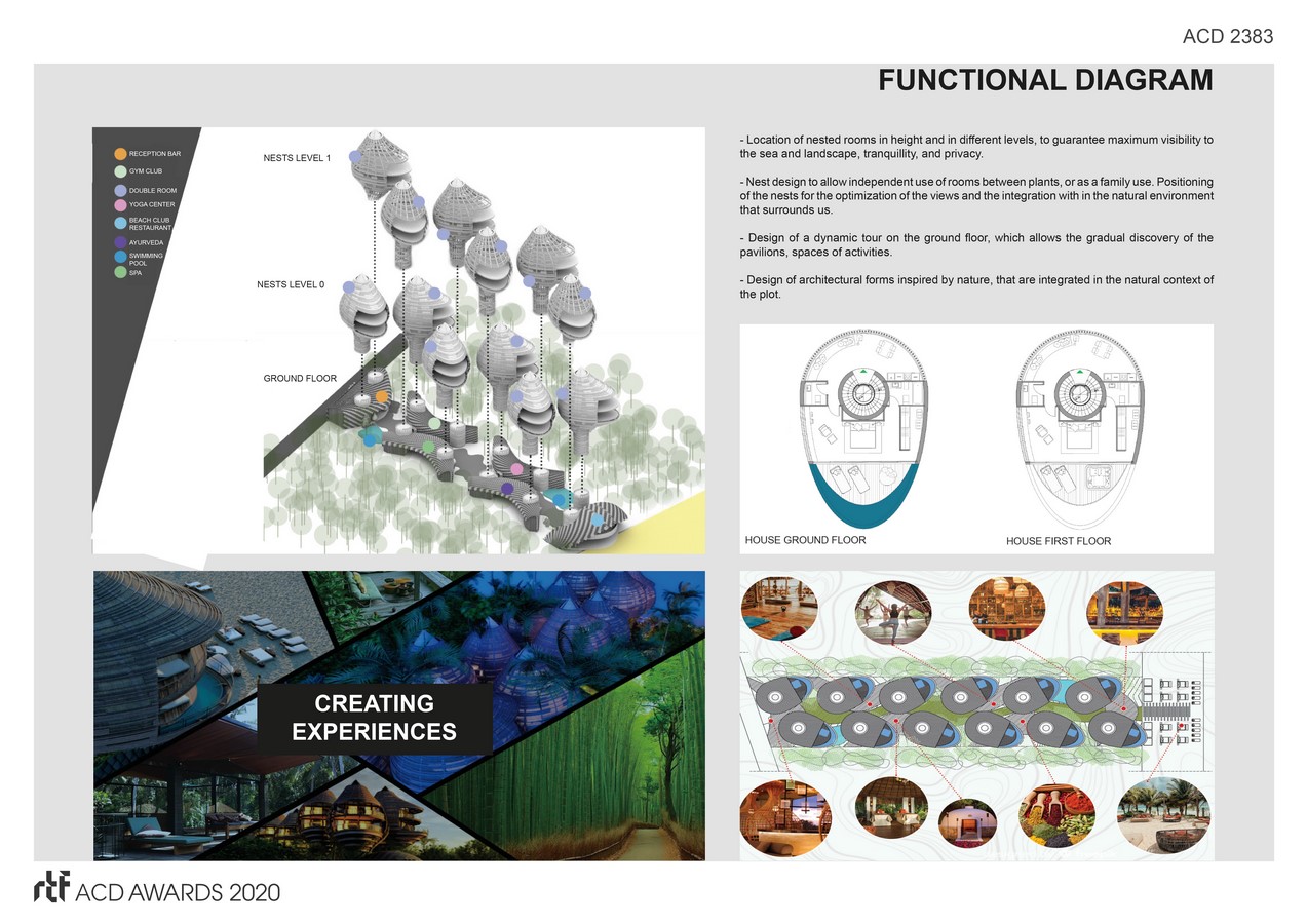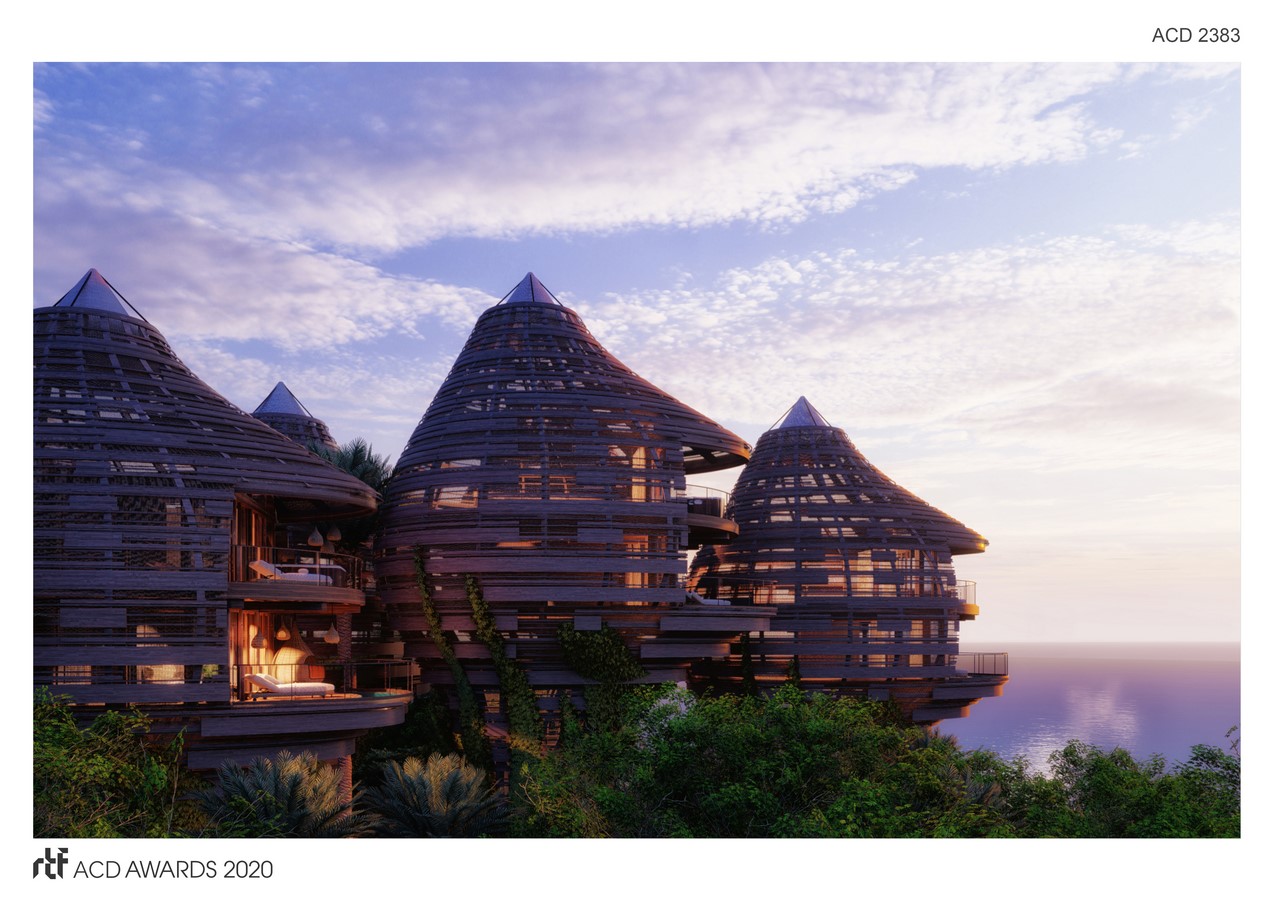 The location of the rooms at height and at different levels guarantees the maximum visibility to the sea and landscape, tranquility and privacy as well as optimisation of integration of natural environment. The natural ventilation of the nests will create a soft interior microclimate.