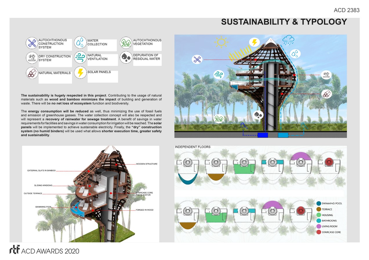 The sustainability is hugely respected in this project. Contributing to the usage of natural materials such as wood and bamboo minimizes the impact of building and generation of waste. There will be no net loss of ecosystem function and biodiversity. The energy consumption will be reduced as well, thus minimizing the use of fossil fuels and emission of greenhouse gasses.