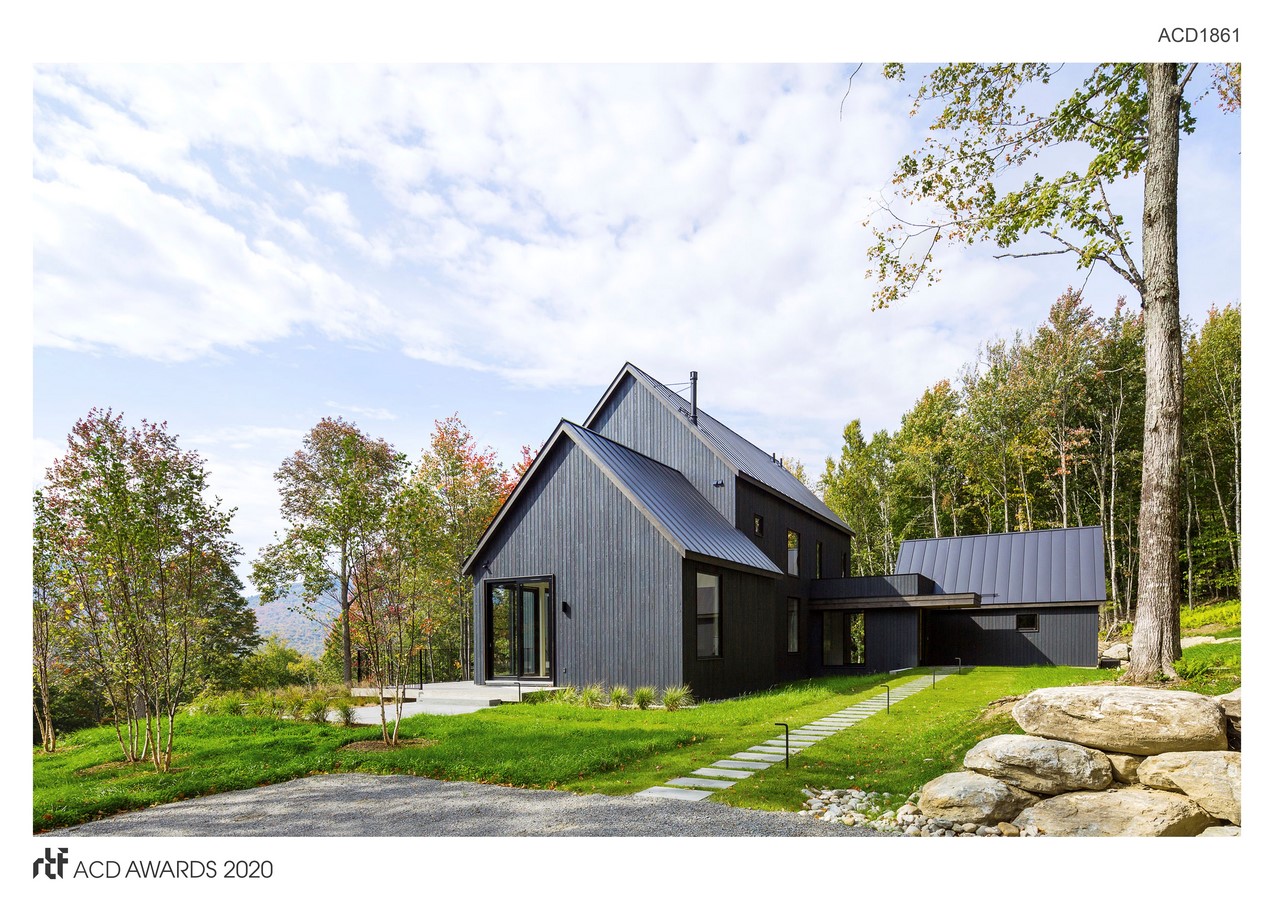 An ambition to implement an architecture that thoughtfully incorporated energy efficiency and low-maintenance construction led to a reimagining of the vanishing Vermont farmhouse as a vernacular building for the modern world. The house design and landscaping would be low-maintenance and unfussy. Our approach was to employ elemental architectural forms amid a lightly edited landscape. Two gabled volumes clad in charred and stained, almost-black siding wedge into the slope while a third volume nestles uphill to form an L-shaped plan linked by a glassy entry node. We located the house at woods’ edge where the varied terrain, long views and dense woods could all be appreciated, and fully integrated into the design.