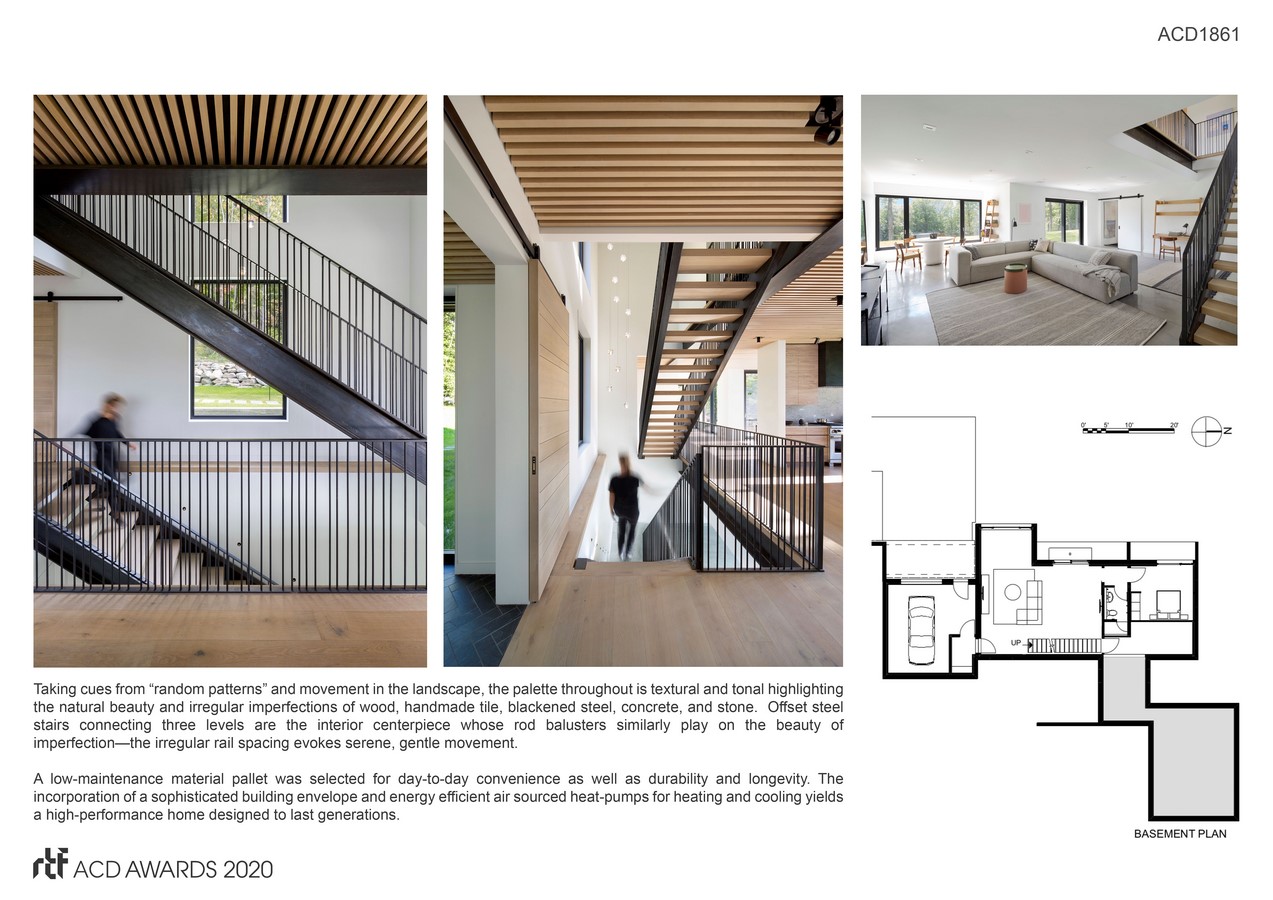 Taking cues from “random patterns” and movement in the landscape, the palette throughout is textural and tonal highlighting the natural beauty and irregular imperfections of wood, handmade tile, blackened steel, concrete, and stone.  Offset steel stairs connecting three levels are the interior centerpiece whose rod balusters similarly play on the beauty of imperfection—the irregular rail spacing evokes serene, gentle movement.