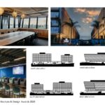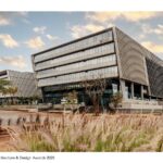 The elevated retail podium provides a second layer of response. The brief demanded not only workplace and commercial efficiency but also the creation of a vibrant public realm that would anchor the precinct. The sculptural podium, clad in stone and articulated with angular planters and stairways, rises above street level to form a secure, active, and pedestrian-friendly environment. It houses an anchor tenant alongside smaller pods, ensuring a mix of scales and activities. The integration of landscaped terraces and gardens further enhances its accessibility and vitality, while a two-level subterranean parking garage resolves the challenge of accommodating large volumes of vehicles discreetly and efficiently.