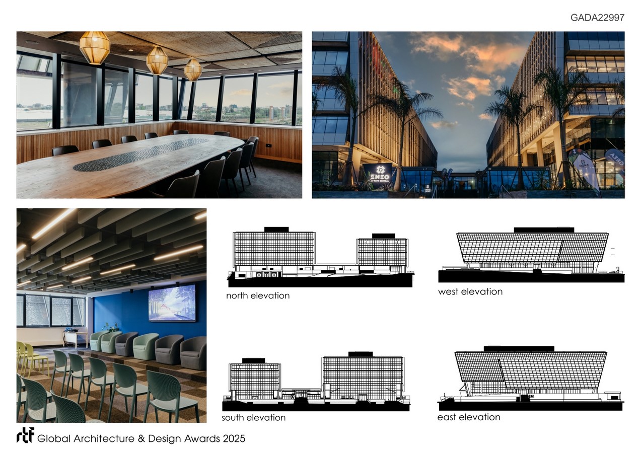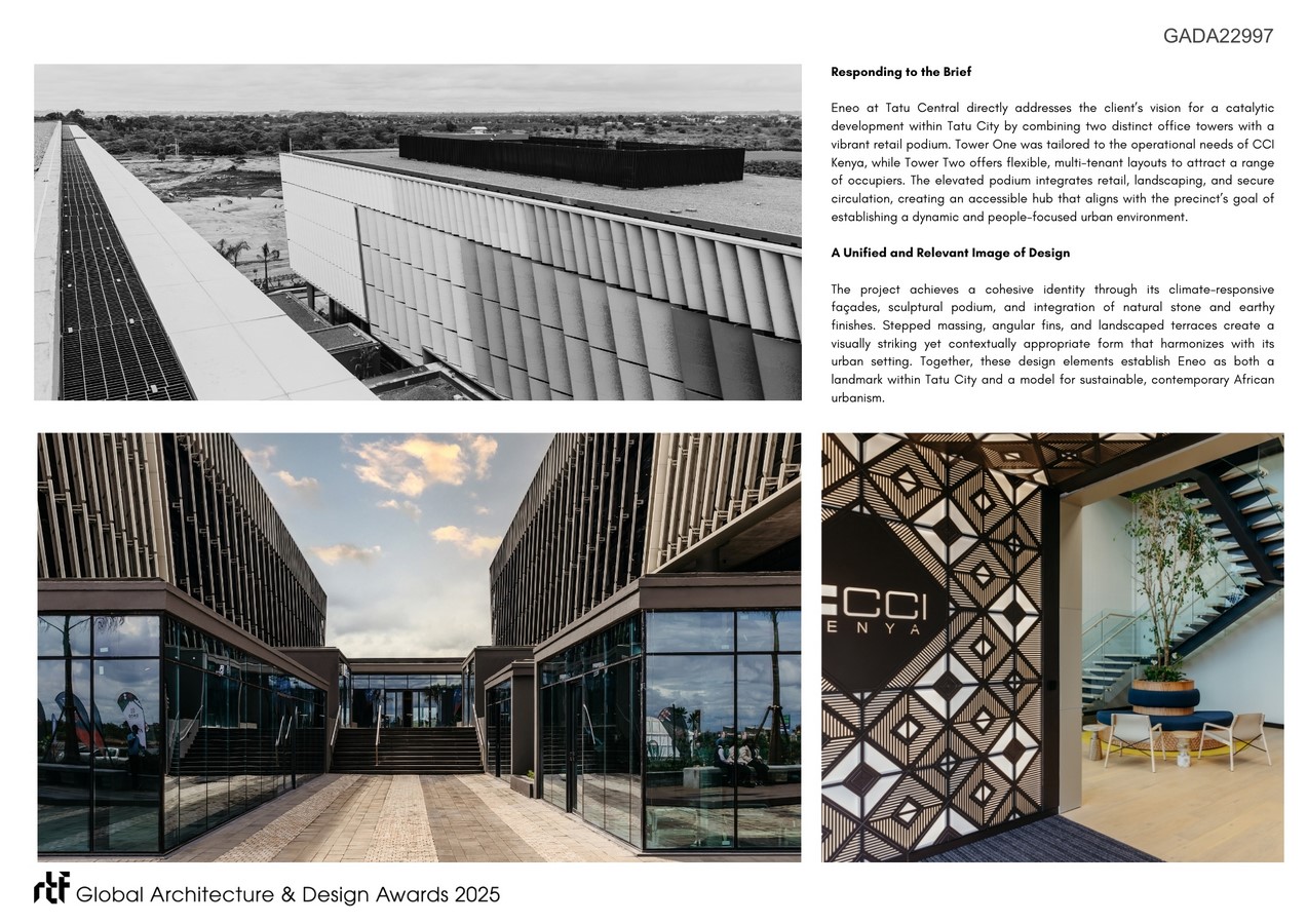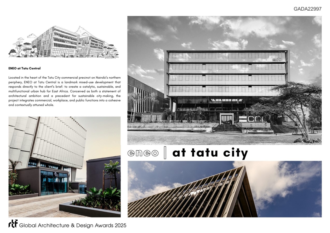 Located in the heart of the Tatu City commercial precinct on Nairobi’s northern periphery, ENEO at Tatu Central is a landmark mixed-use development that responds directly to the client’s brief: to create a catalytic, sustainable, and multifunctional urban hub for East Africa. Conceived as both a statement of architectural ambition and a precedent for sustainable city-making, the project integrates commercial, workplace, and public functions into a cohesive and contextually attuned whole.