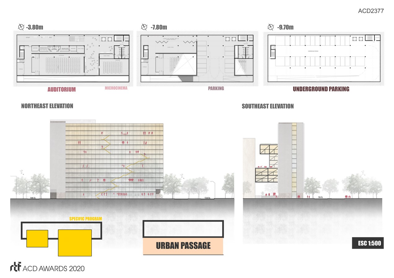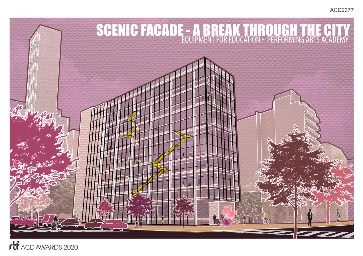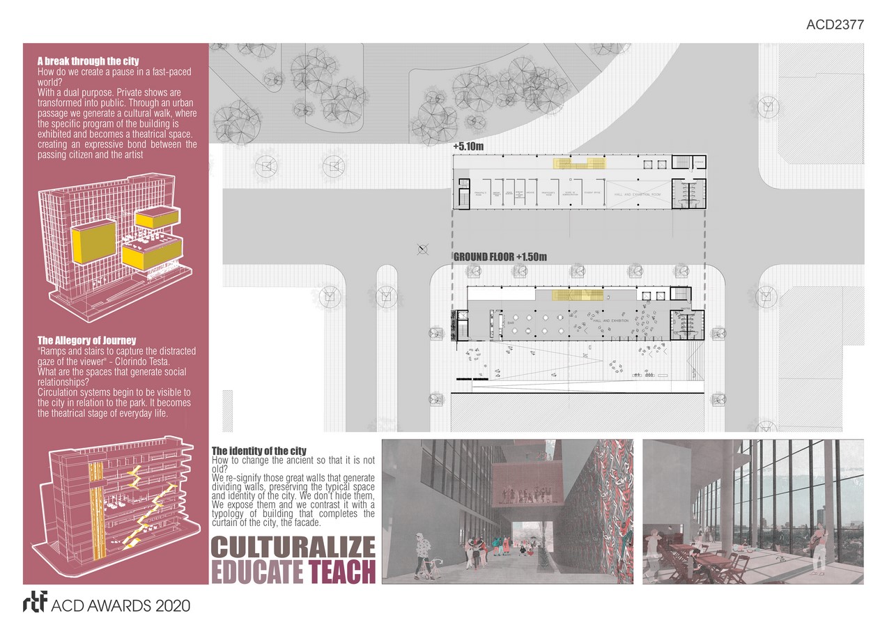 On the other side, the private shows are transformed into public through an urban passage, generating a cultural walk, where the specific program of the building is exhibited and becomes a theatrical space. Thus an expressive bond is created between the passing citizen and the artist. A break through the city, in the fast-paced world.