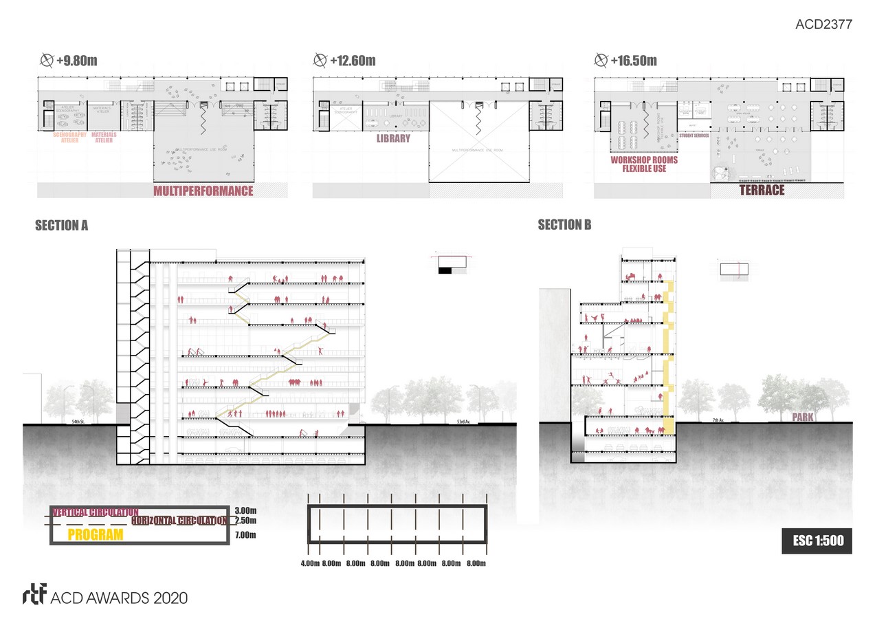 It is a public facility for education, an academy of performing arts . With a double facade and a dual purpose, we rebuilt the urban curtain that frames the San Martín park. On one hand, the circulation systems starts to be visible to the city in relation to the park. They become the theatrical stage of everyday life.
