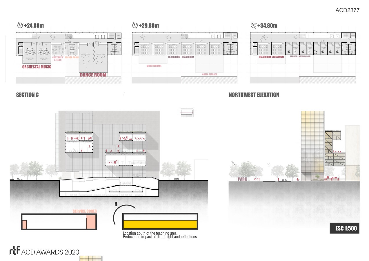 A regular modulation that responds to the appropriate proportions for the basic teaching classroom, is arranged transversely to the volume. Longitudinally, three strips are presented: the vertical circulation as a stage, the horizontal circulation, and the programmatic one that, oriented to the south by design recommendations for schools, houses the outstanding volumes of the building’s specific program (dance halls, orchestras, multi-performance, etc).