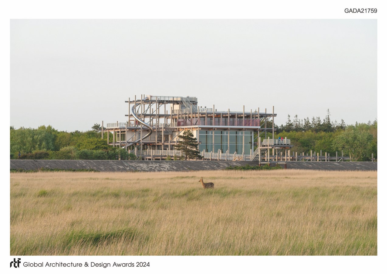 Each of the five cubes of the structure serves a distinct purpose: they house an analog game venue, an information center + shop, a restaurant, a staff office, and sanitary facilities. The individual cubes are enclosed on three sides with a suspended wooden facade and open on one side with oversized windows, providing impressive views of the sea, the adjacent biotope, the promenade, and the distant landscape.