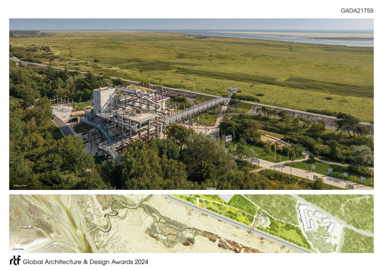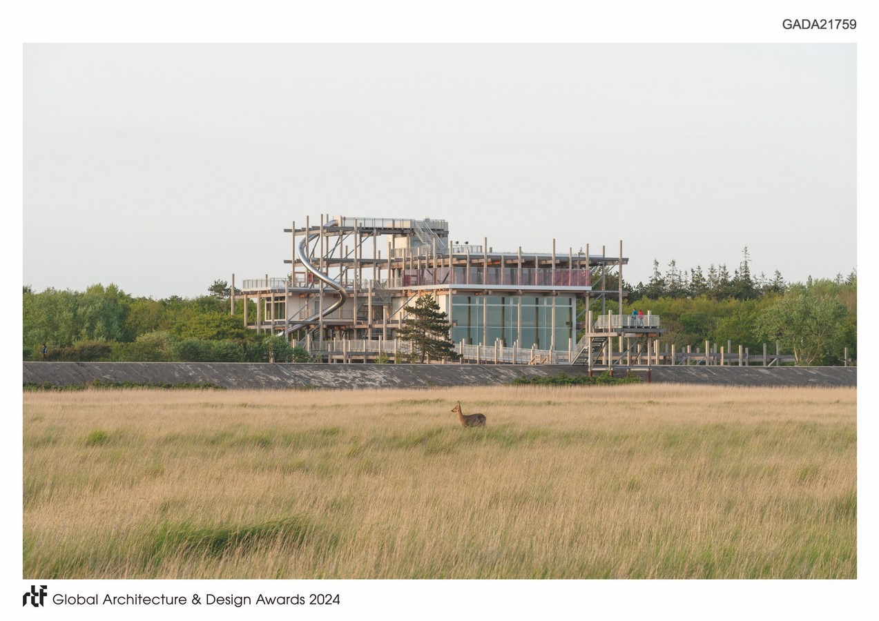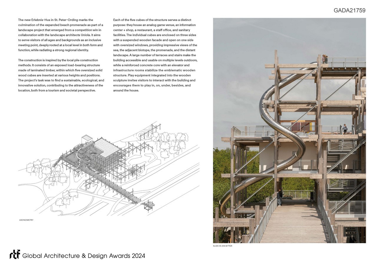 Each of the five cubes of the structure serves a distinct purpose: they house an analog game venue, an information center + shop, a restaurant, a staff office, and sanitary facilities. The individual cubes are enclosed on three sides with a suspended wooden facade and open on one side with oversized windows, providing impressive views of the sea, the adjacent biotope, the promenade, and the distant landscape. A large number of terraces and stairs make the building accessible and usable on multiple levels outdoors, while a reinforced concrete core with an elevator and infrastructure rooms stabilize the emblematic wooden structure. Play equipment integrated into the wooden sculpture invites visitors to interact with the building and encourages them to play in, on, under, besides, and around the house.