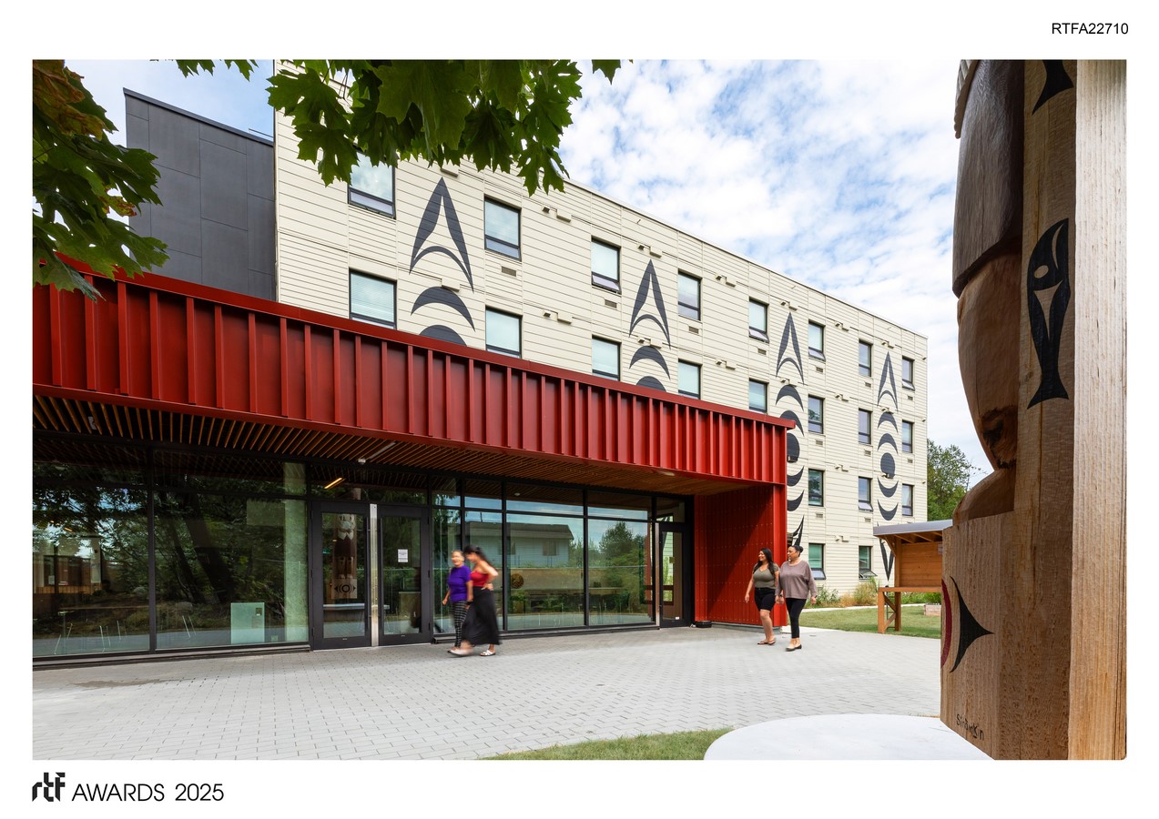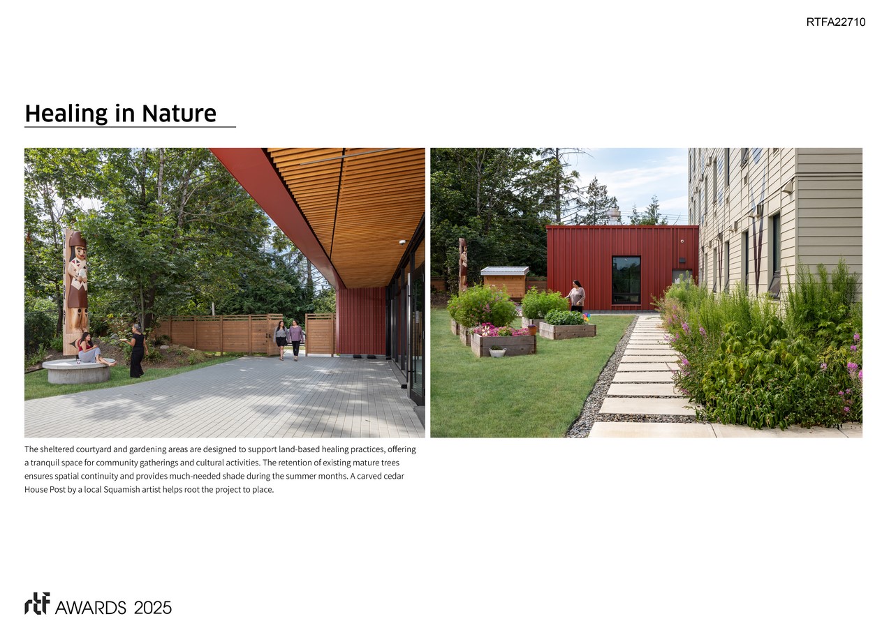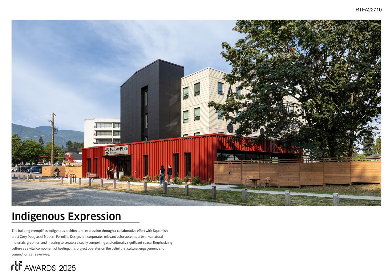 The team designed naturally lit spaces that foster daily living, build community, and promote individual healing. The building showcases Indigenous architectural expression in collaboration with Squamish Nation artist Cory Douglas, of Modern Formline Design, using relevant colour accents, artworks, natural materials, graphics, and massing. Culture as a means of promoting healing was a priority for this project, with the belief that culture can save lives. The objective is to counteract the harmful effects of historical and current colonial policies by offering healing opportunities firmly grounded in cultural values, land-based programming, and de-colonizing practices.