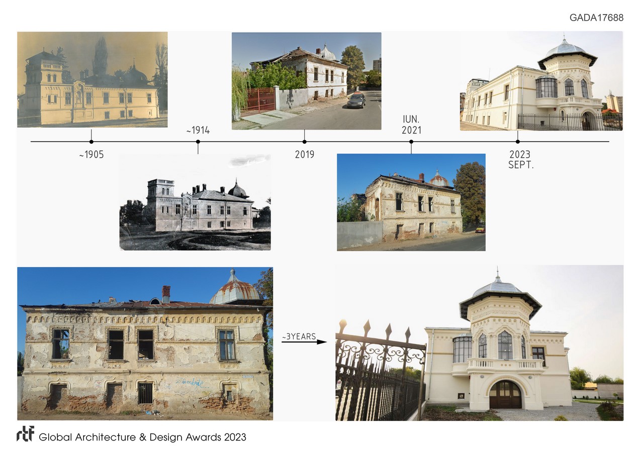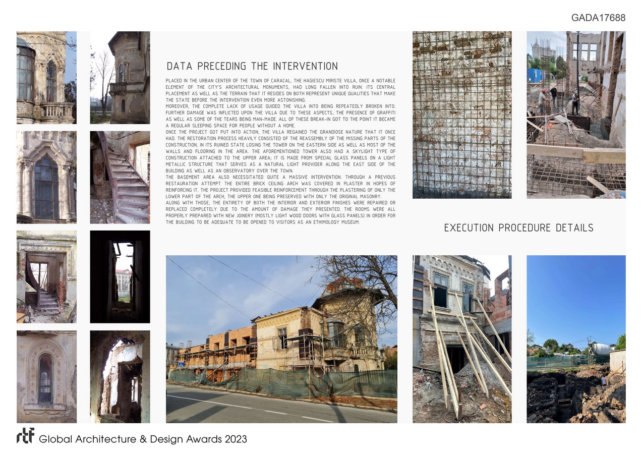 Placed in the urban center of the town of Caracal, the Hagiescu Miriste villa, once a notable element of the city’s architectural monuments, had long fallen into ruin. Its central placement as well as the terrain that it resides on both represent unique qualities that make the state before the intervention even more astonishing.