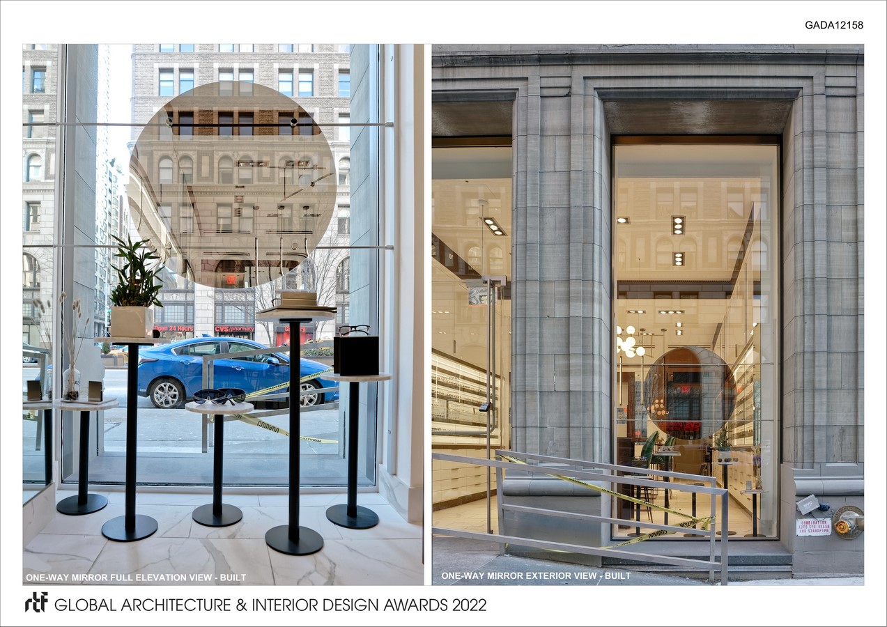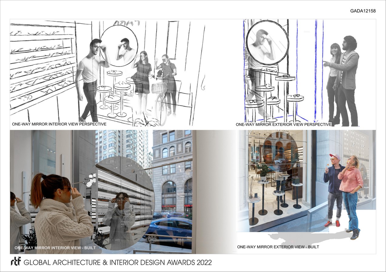 - To address the question of how pedestrians can take notice of the store, we first take advantage of the floor-to-ceiling window. In front of it is installed a one-way mirror shaped like a monocle, which becomes a practical gesture of allowing the outside public to see how the store patrons look at themselves and their reflections. Furthermore, it sets off an inadvertent interaction between the public and the patron by means of display and observation, which also serves as personalized advertisement of the merchandise.