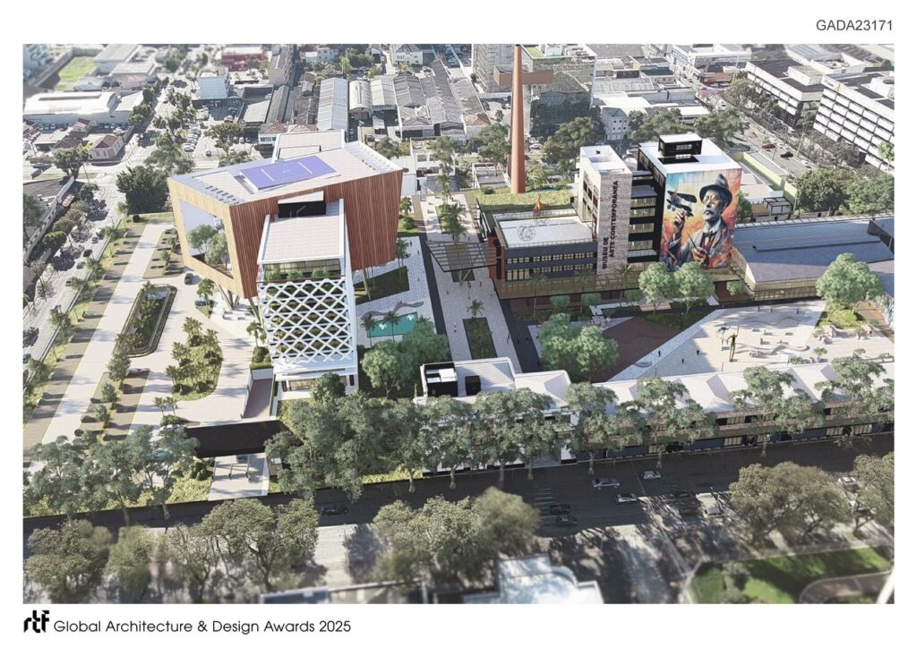 The project develops around three core principles: Adaptive Use, Urban Integration, and Catalyst. In the seven retrofit blocks, industrial memory is preserved, reinterpreted, and transformed into museums, laboratories, innovation hubs, multi-use spaces, and cultural areas. Facades incorporate graffiti by local artists, promoting cultural identity and dialogue with the community. The new contemporary building complements the historical structures, balancing history and modernity, with post-tensioned slabs and raised floors allowing large spans, visual openness, and flexible use; its metal mesh façade symbolizes the 399 municipalities of Paraná, inclined pillars abstractly evoke the force of the Iguaçu Falls, and ecological wood connects the structure to the Atlantic Forest.