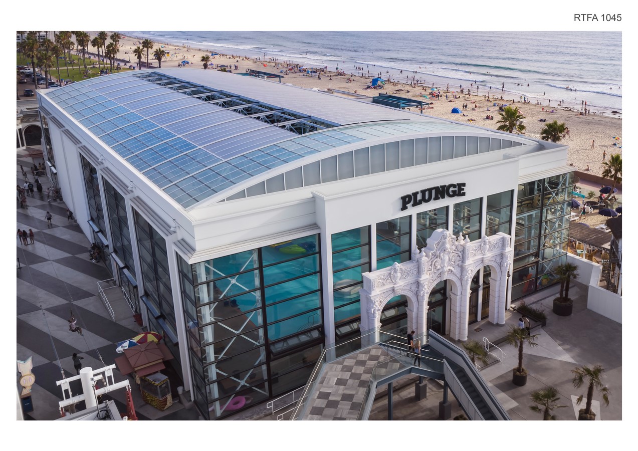Centered in the famous oceanfront Belmont Park, Fit Plunge is a two-sided fitness building joined as one, named Fit on the south and Plunge on the north. The 1925 historic ‘Plunge’ swimming pool, is southern California’s oldest and largest saltwater pool holding 400,000 gallons of water and the centerpiece along with the Giant Dipper Roller Coaster as part of the original Mission Beach Amusement Center, now known as Belmont Park.