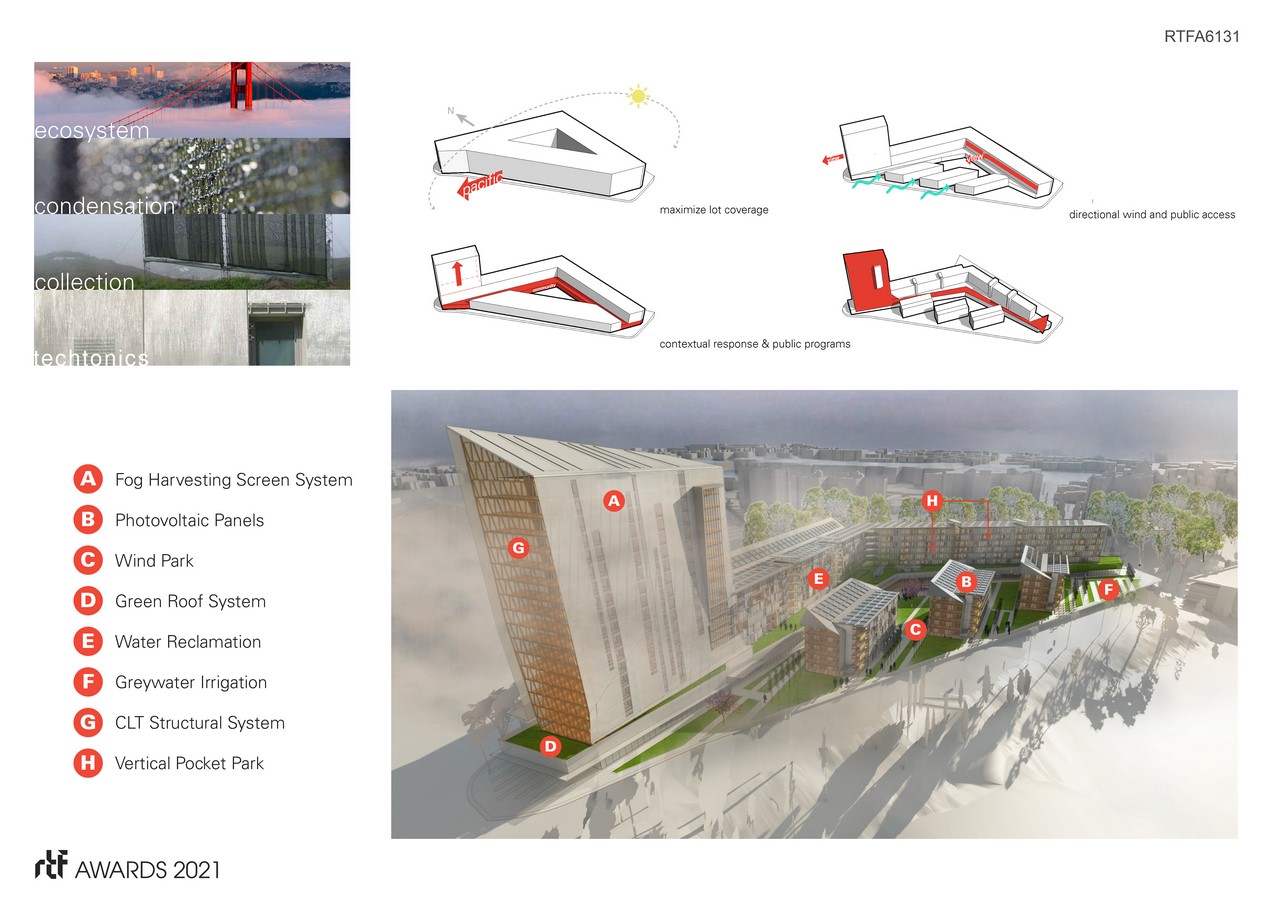Challenged by the Architecture at Zero competition to create a net zero energy student housing project on the San Francisco State university campus, Little embraced the specific microclimate of western San Francisco with the design of Fog Catcher, student housing that provides net-positive energy, does not need a mechanical system for the student housing and relies on passive strategies for heating and cooling.