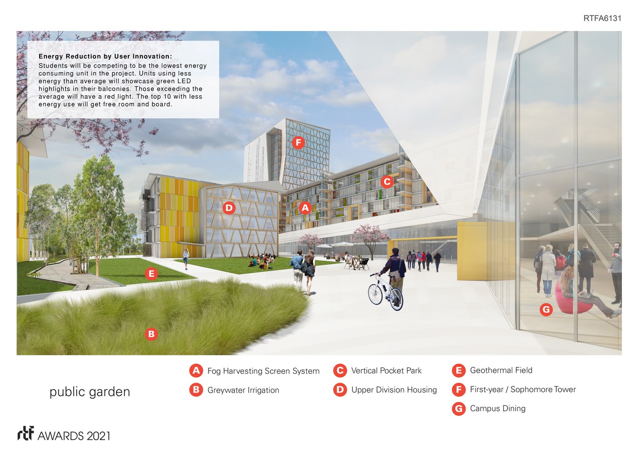 Through the smart, tiny living concept and almost entirely passive strategies, this project requires only 65- 75% of typical square footage for comparable student housing and promises to be not just net-zero but actually Net-Positive by 18%. Daylight, natural ventilation and appropriate scale of living drove our design that accommodates 2,168 beds.