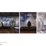 The entire gallery is “papered” in a bold graphic printed on 8.5×11 Tyvek leaves, creating a bold, textured environment that graphically holds the narrative while unifying diverse stories. Given that the library’s collection is almost entirely made up of books, the challenge of making them enjoyable to visitors meant creating a strong visual and spatial armature.